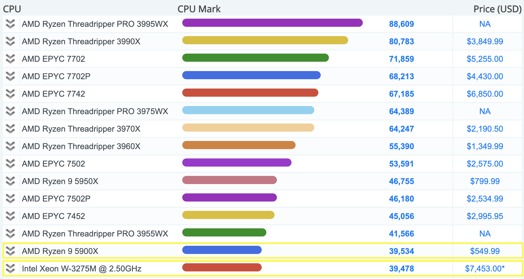 I went to the first benchmark site that Google had in "processor benchmark" search results to remove any bias; so I used CPUBenchmark.net. They seem to have a good blend of computational tasks and single vs multi-core performance to arrive at their single benchmark scores for CPUs. Everyone has their reasons, preconceived notions, brand loyalty, ecosystem ties, lock-ins and application dependencies, so I'm not here to judge or call anyone stupid. But for me, I couldn't possibly justify buying an Intel Mac Pro at anywhere near these astronomical prices, when AMD and NVidia are absolutely killing it on the PC side.