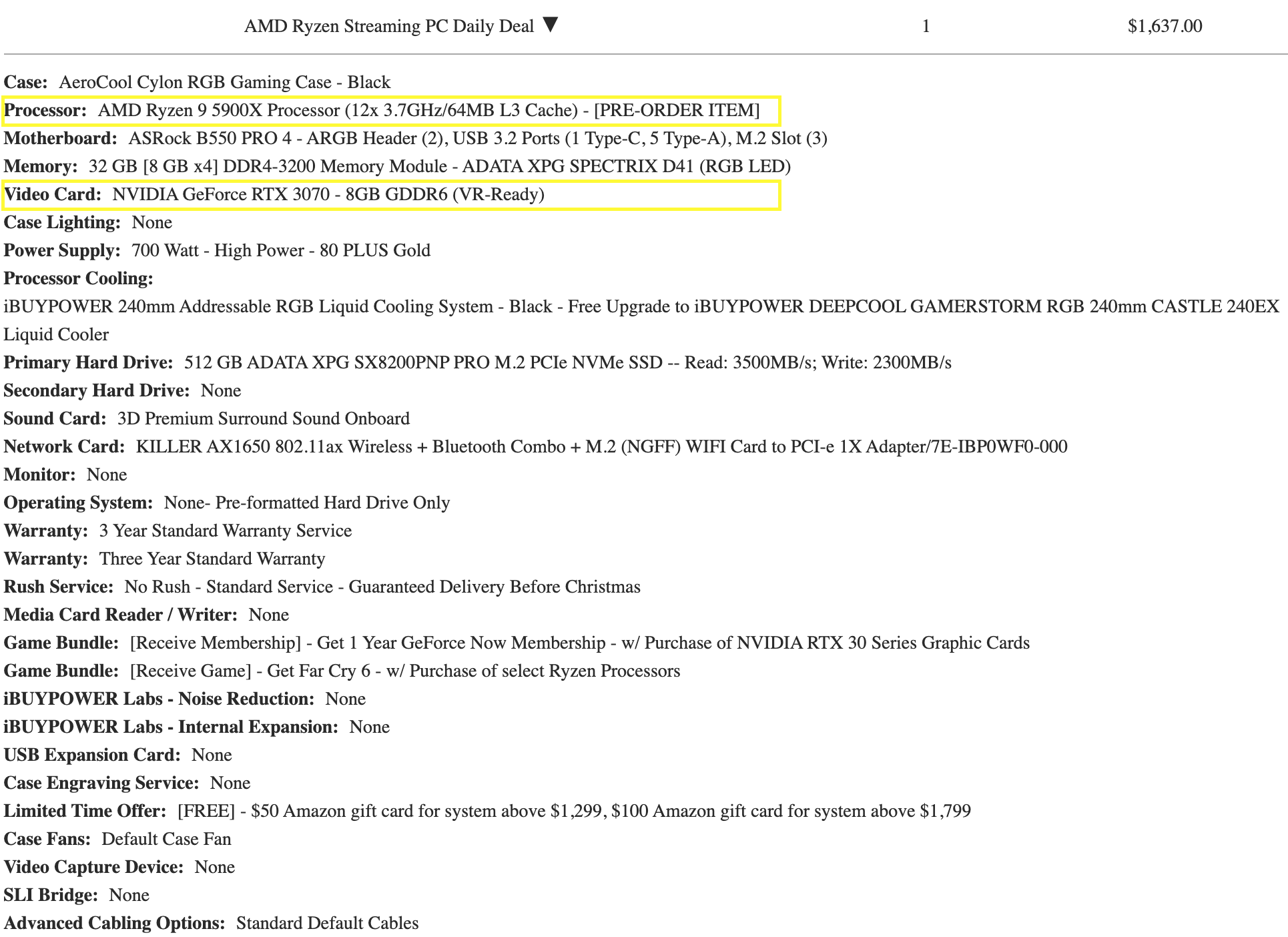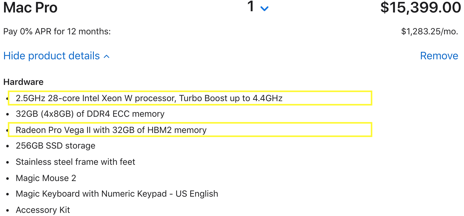 I was able to get the following configuration from iBuyPower for $1,558 after factoring in $50 Amazon card, credit card rewards, sale price and taxes. A Ryzen 5900X, NVidia RTX 3070, 32GB DDR4 3200 ram, 512GB NVME SSD. The equivalent Mac Pro with a Xeon W-3275M and a Pro Vega II, 32GB RAM and 512 SSD costs $15,833 after all taxes and Apple 3% cash back. See screenshots below. I know the two systems aren't identical, but close enough. The PC build has PCIE 4.0 motherboard and Wifi 6 was included, while Apple has TB3 ports and is aesthetically pleasing. Apple has a 32GB pro Vega card, but what edge it gives in video processing when maxed out, it loses in tasks like gaming, ray tracing and VR to the RTX 3070.