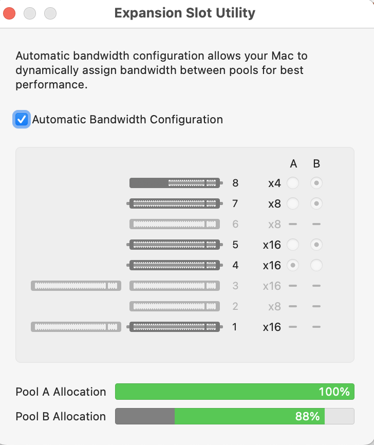 So looking at some of these Expansion Slot Utility screencaps, I decided to re-check mine, and was shocked to see the previously 100% on A & B was now showing 125% on B... then I realised something for which I hadn't quite comprehended the full consequences - plugging in cables which change the port format (eg USB Type-C to Type-A, B, Lightning etc.) eats lane allocation (according to the utility).