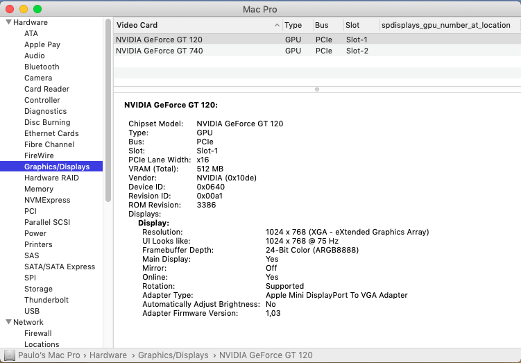 Thanks, I didn't know about that (Mojave not supporting two GPUs). Seems very strange to me; does anyone know if that's also the case with Catalina? If not, I'll give it a try. FWIW, the GT120 DOES work under Mojave (see attached pics), but it seems I can't get my GT740 to work, neither alone nor in combination with the GT120, although it's recognized in system info as with driver installed... As I said, they both work fine in High Sierra.Hi,