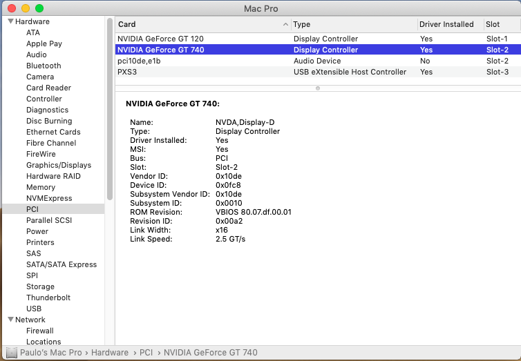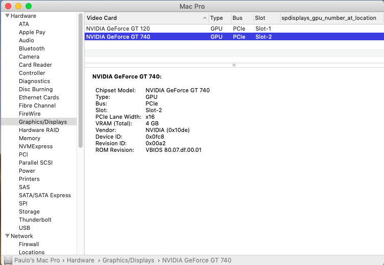 YW!Thanks, I didn't know about that (Mojave not supporting two GPUs). Seems very strange to me; does anyone know if that's also the case with Catalina? If not, I'll give it a try. FWIW, the GT120 DOES work under Mojave (see attached pics), but it seems I can't get my GT740 to work, neither alone nor in combination with the GT120, although it's recognized in system info as with driver installed... As I said, they both work fine in High Sierra.