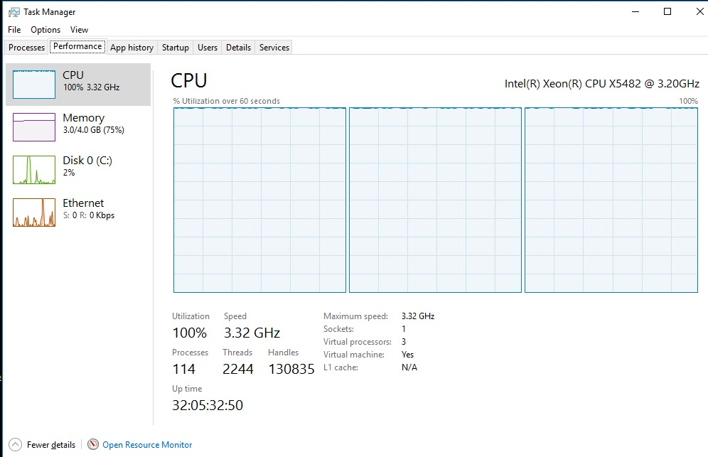 I'm fully aware of "Resource Monitor" and have dug into it many times hoping for an answer to this previously, it had yielded no info that was valuable. When it shows 1 process that is using 19% CPU (usually one of the handful of svchost.exe processes or on occasion the mcafee on access scanner, even though the only application that was open was taskman) with the rest floating between 0% and maybe 3% and yet all cores are pegged at 100%, it doesn't seem to explain anything.
