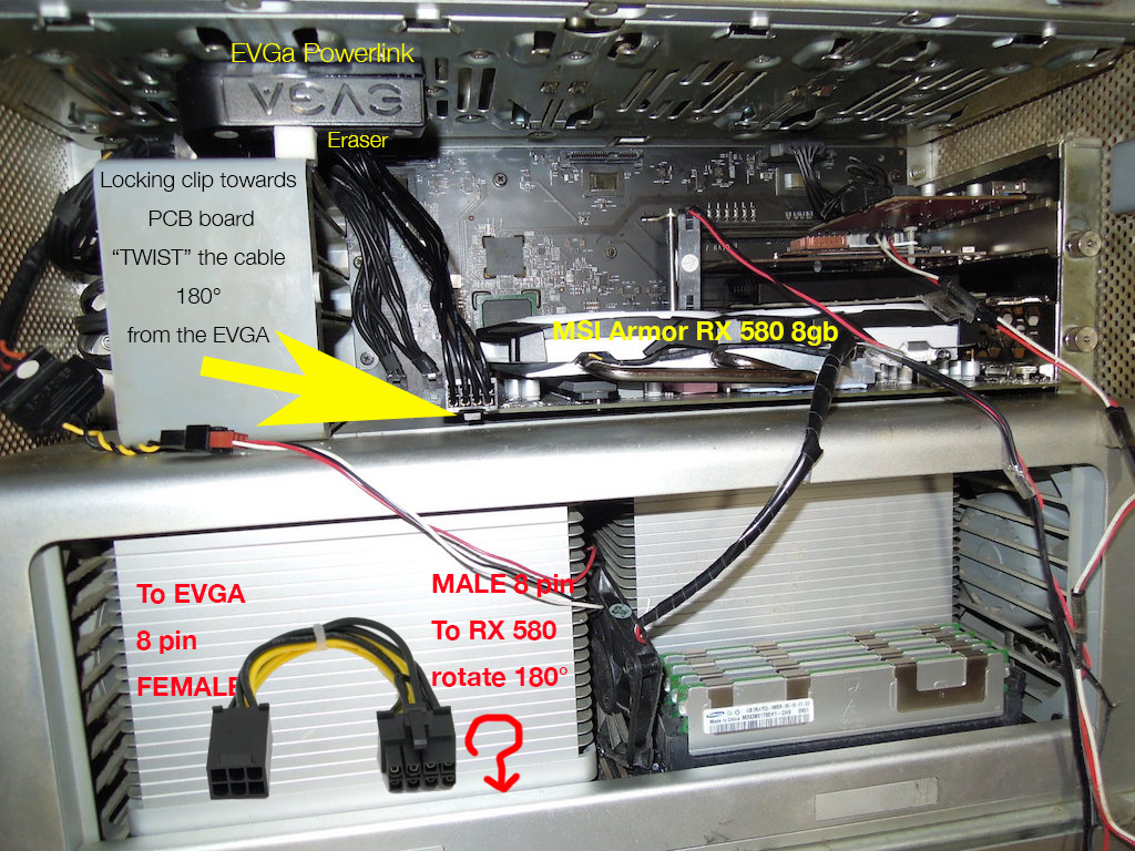 ( I had to use the PowerLINK in BRIDGE mode because AMD now has the RX 580's 8 pin power socket facing downwards towards the PCB. ) Actually, the arrangement allows a little more of the cMP's intake fan to pass just a little more airflow to the RX 580 8gb.