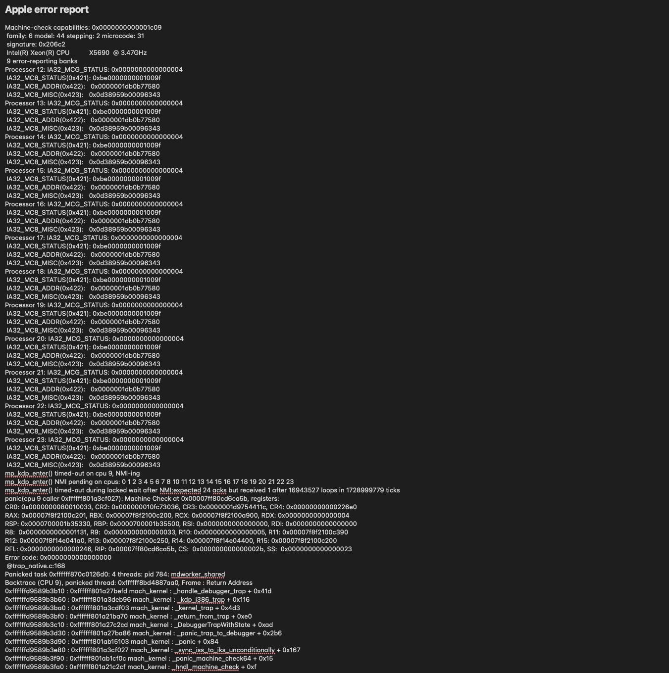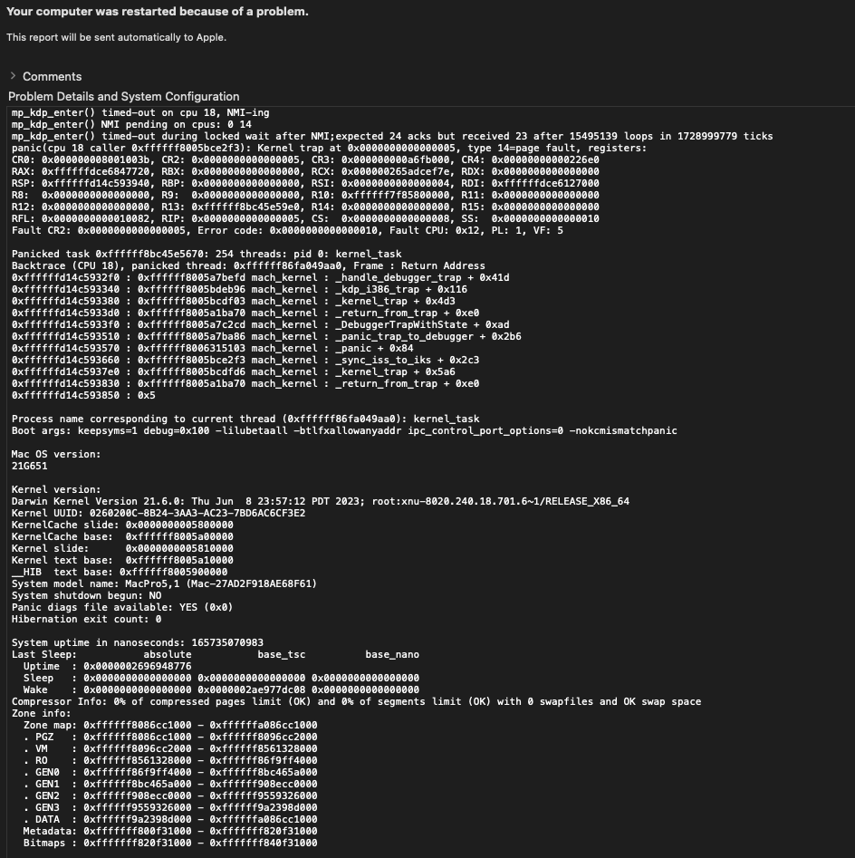 mp_kdp_enter() NMI pending on cpus: 0 1 2 3 4 6 7 8 9 10 11 12 13 14 15 16 17 18 19 20 21 22 23