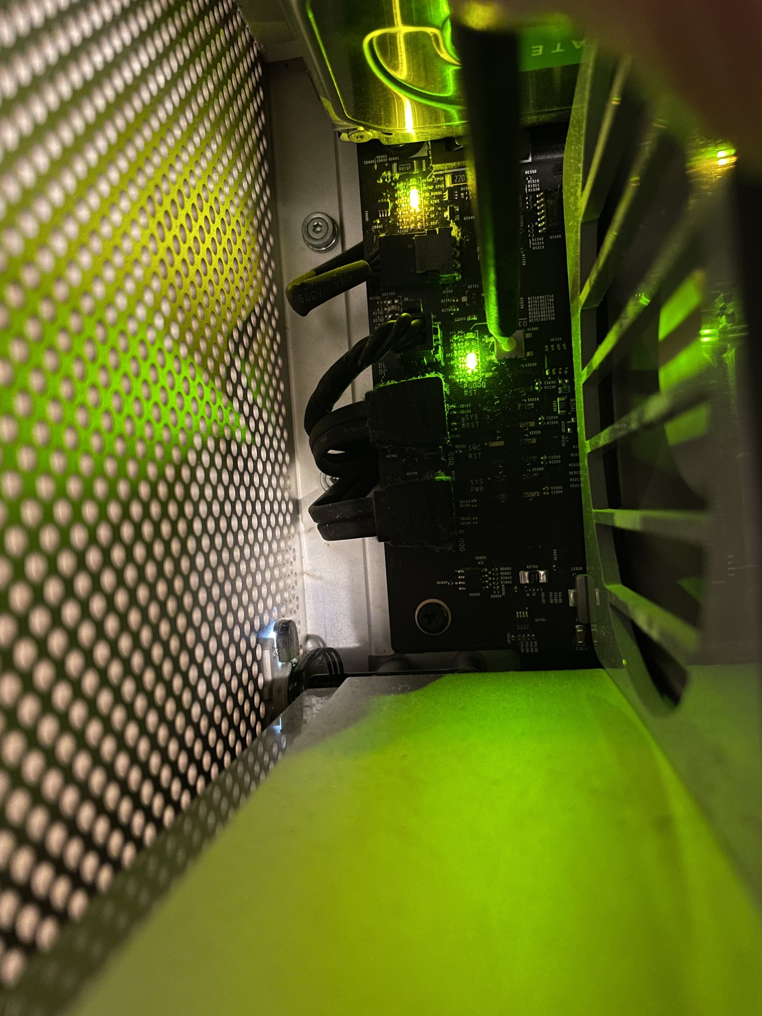 I've had a problem with the mac pro not starting... Only the fans are spinning, there is no start-up sound, when you turn it on, a red led lights up on the memory card for a moment, but then it disappears, I've attached a picture showing that there is a yellow led which is constantly lit. Is the power supply or motherboard cmos battery dead?