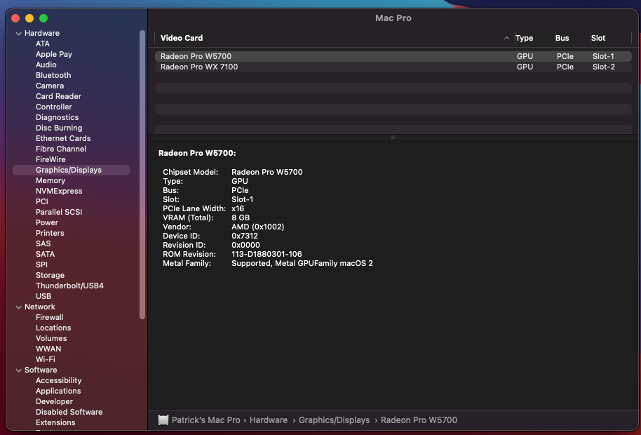 GPU(s) - AMD W5700, AMD WX7100 (Pixlas Mod)