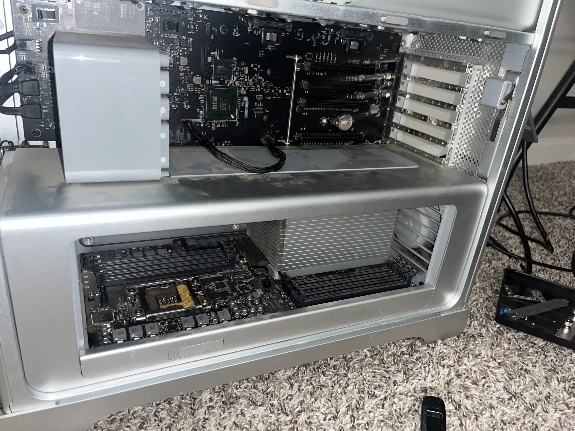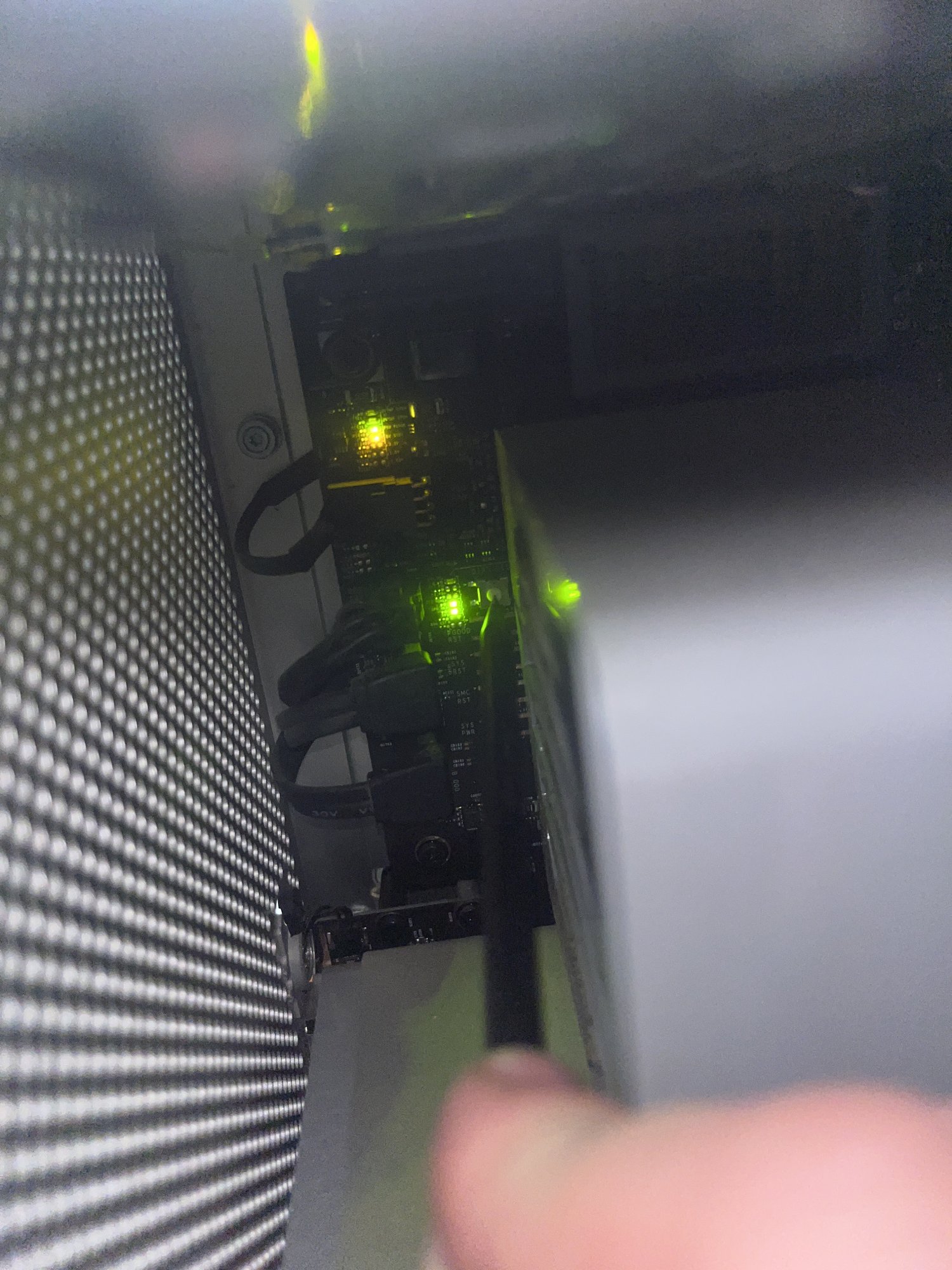 I didn't catch this earlier. The RAM LEDs are not the diagnostic ones on the backplane (logic board), near the power button. Rather, they are a bank of red LEDs on the processor board, near the RAM slots. If a RAM slot is empty, the corresponding LED should be illuminated steadily. ie - on a dual-CPU board like yours, if one stick is installed, you should get at least 7 red LEDs glowing near the RAM slots, one for each empty slot. You'll get 8 red LEDs if the stick you're testing with is bad, or poorly seated.