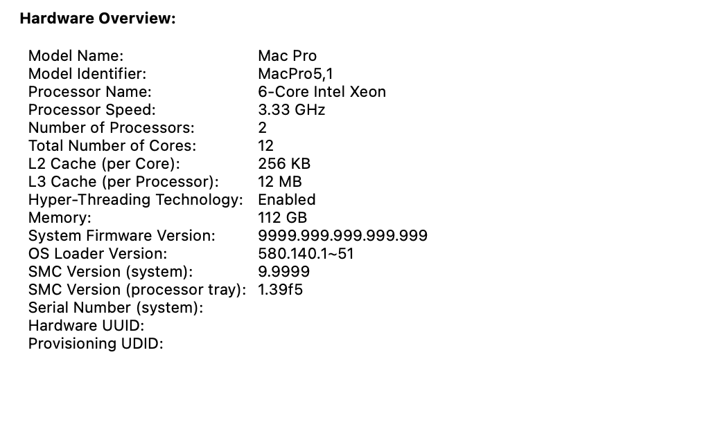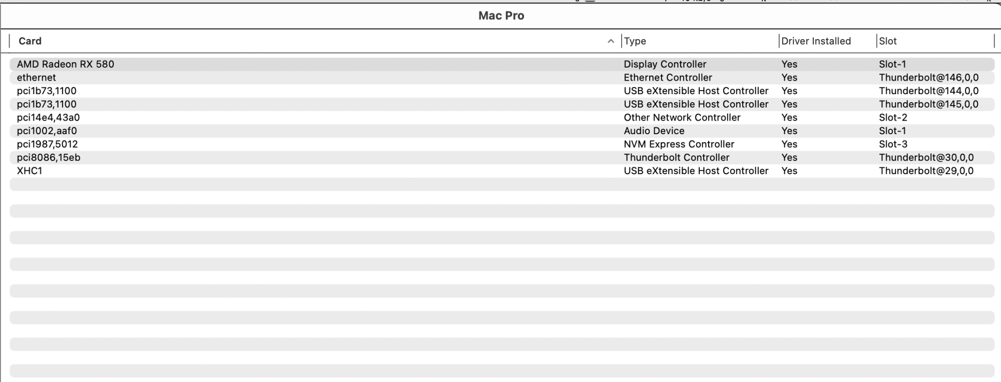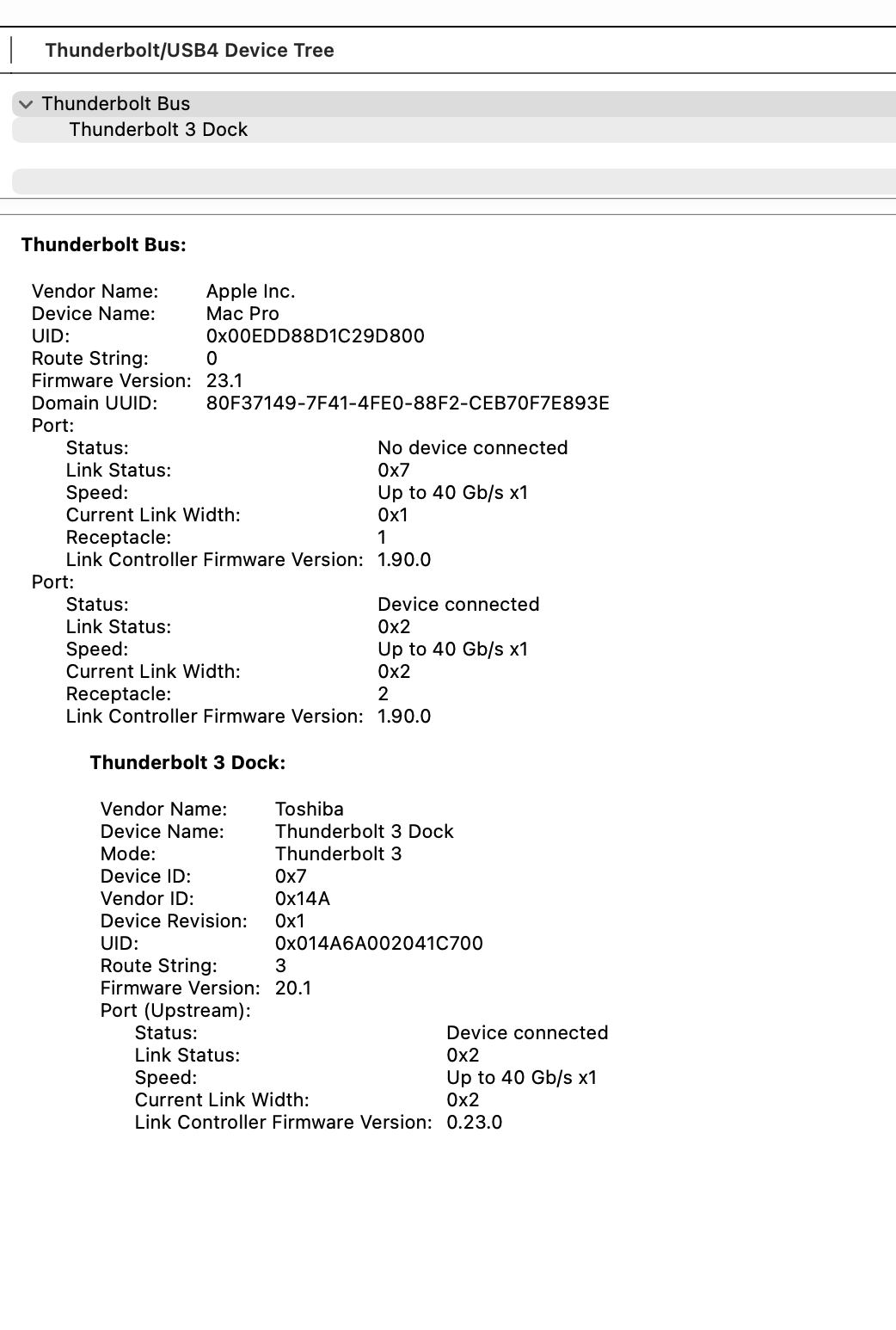 Mac Pro 5,1 running Catalina. 32Gb Ram, RX580 Graphics and a Titan Ridge 2.0.