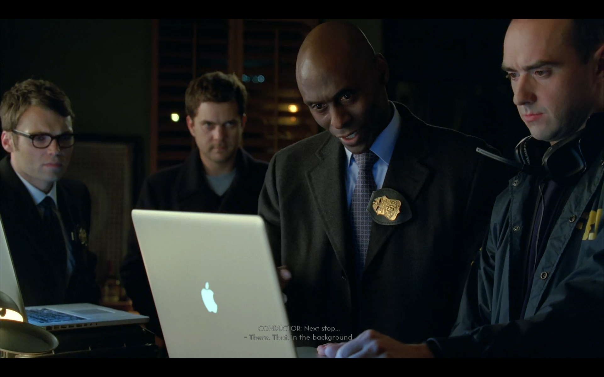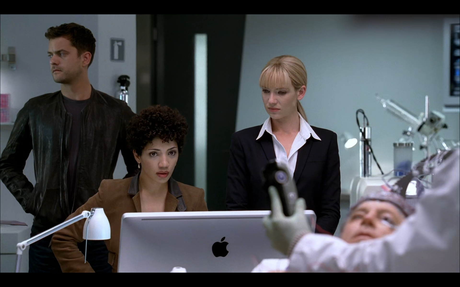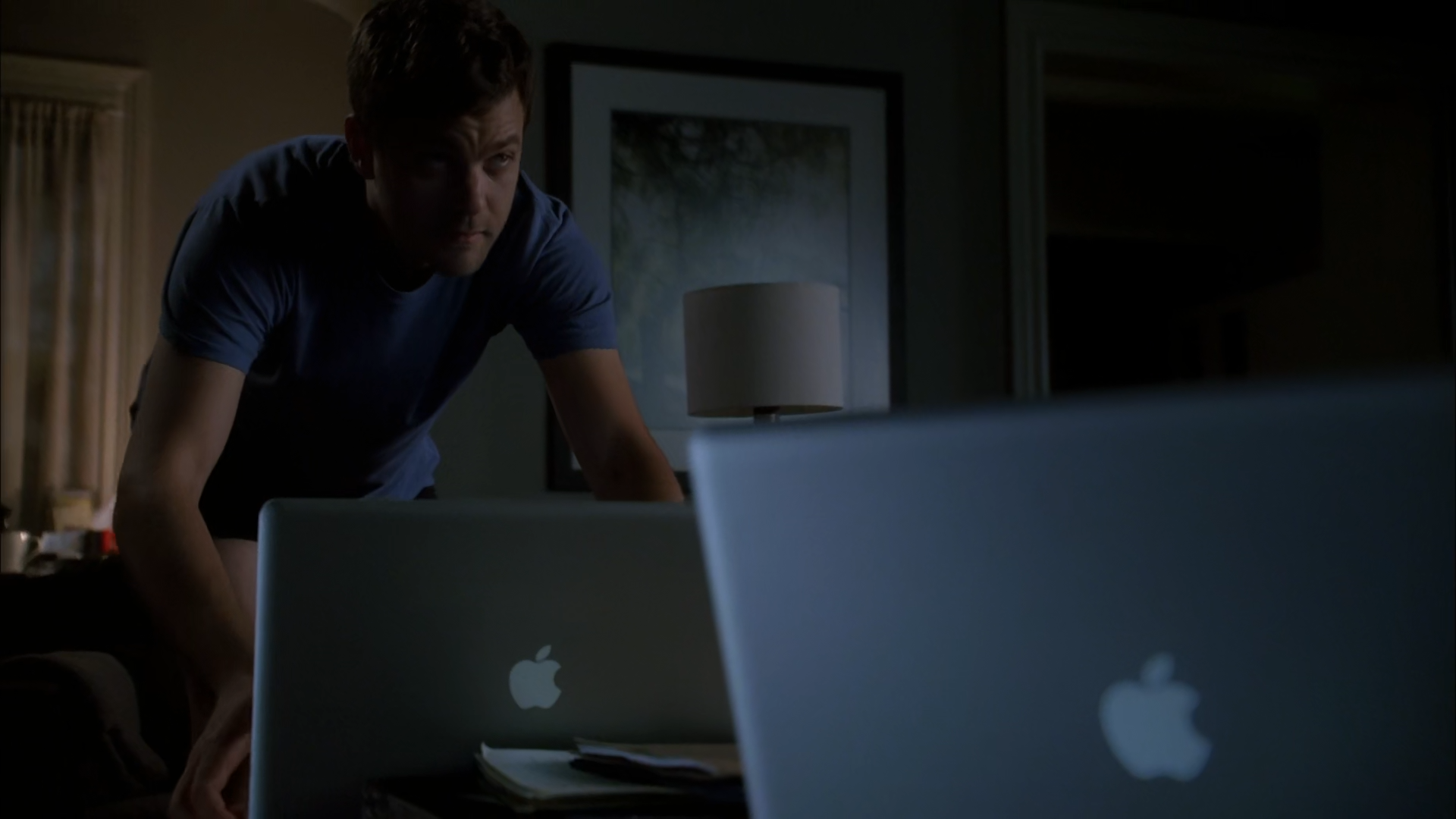 Fringe, Season 3, Episode 8 (“Entrada”), that moment when Peter Bishop grabs the 2009 17" unibody MacBook Pro which isn’t his (his is the one in the foreground) in order to guess the password on Fauxlivia’s work laptop whilst Fauxlivia sleeps. It’s running “Windows”.
