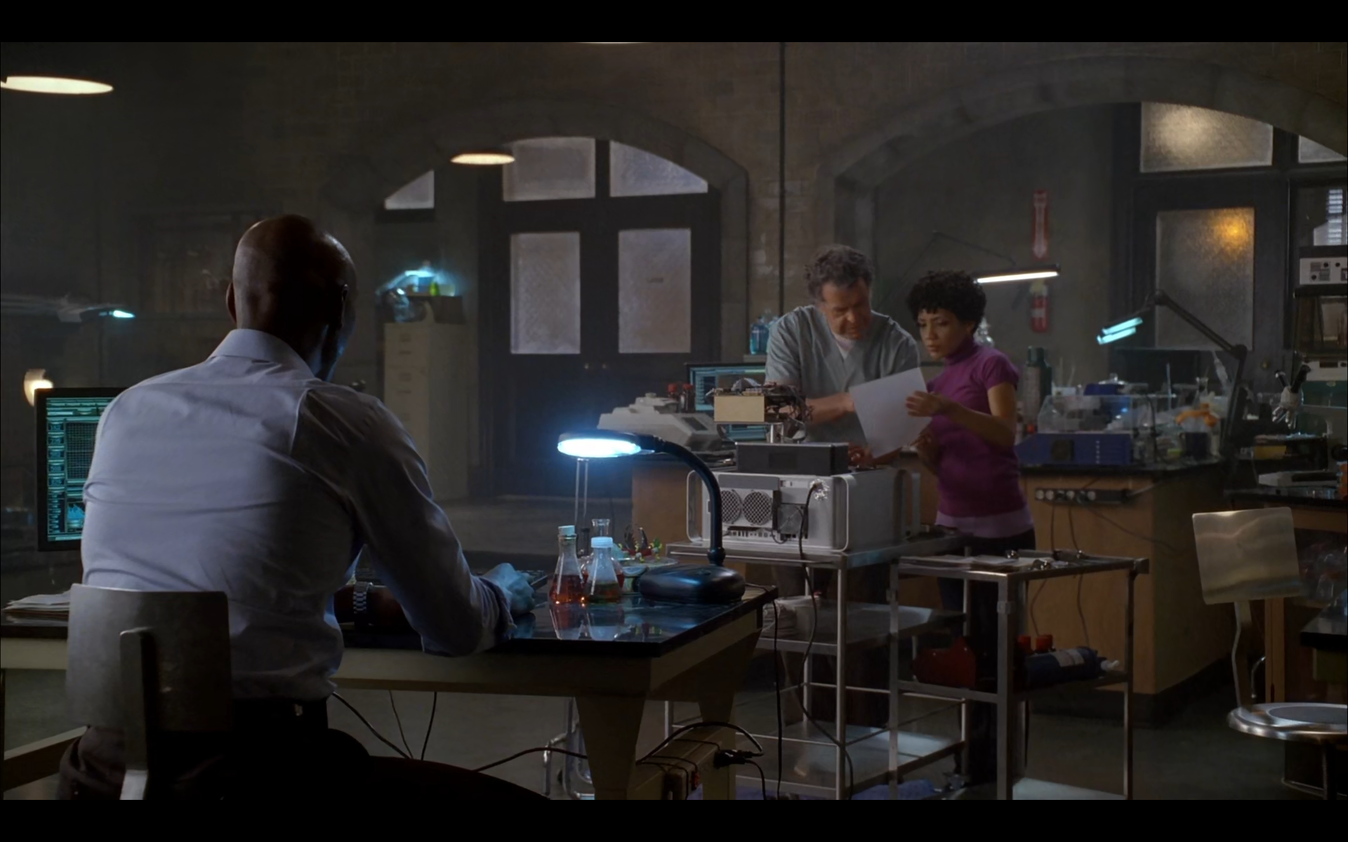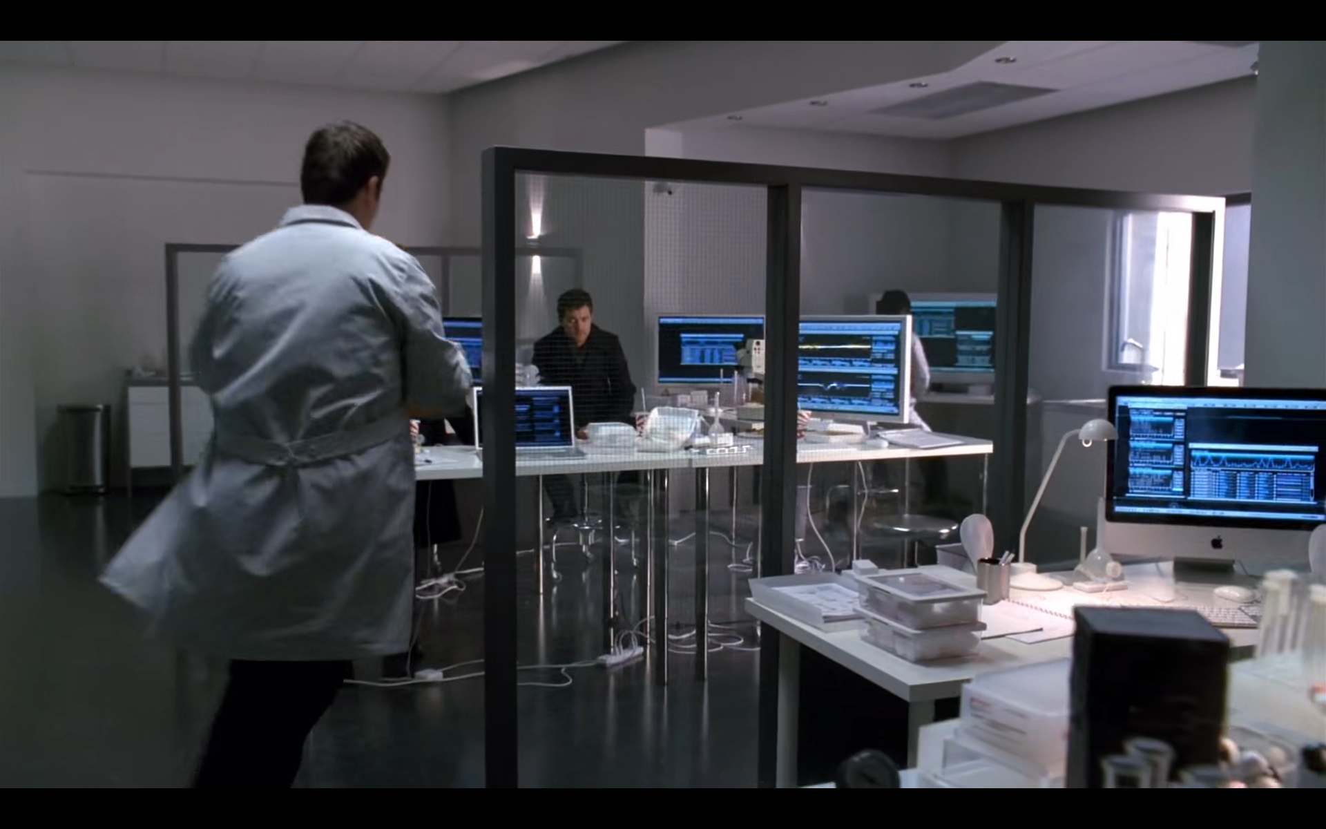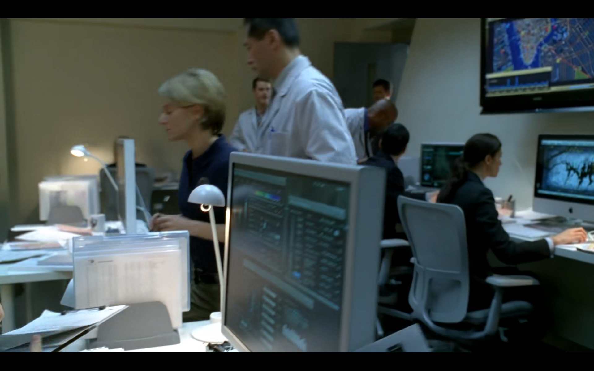 Meanwhile, back at the lab (as seen in s02e15), we see the same late-2009 iMac (background, behind the right arm of the lab coat), two of the aluminium Cinema Displays, a 17-inch MacBook Pro on the table, and probably a mid-2009 iMac in the foreground, in s02e19: