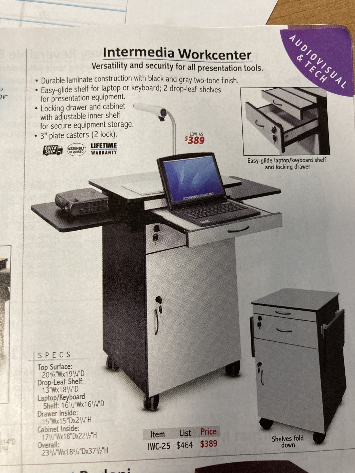 A lovely TiBook on this cart, though the smaller front view seems to show a Unibody MBP.