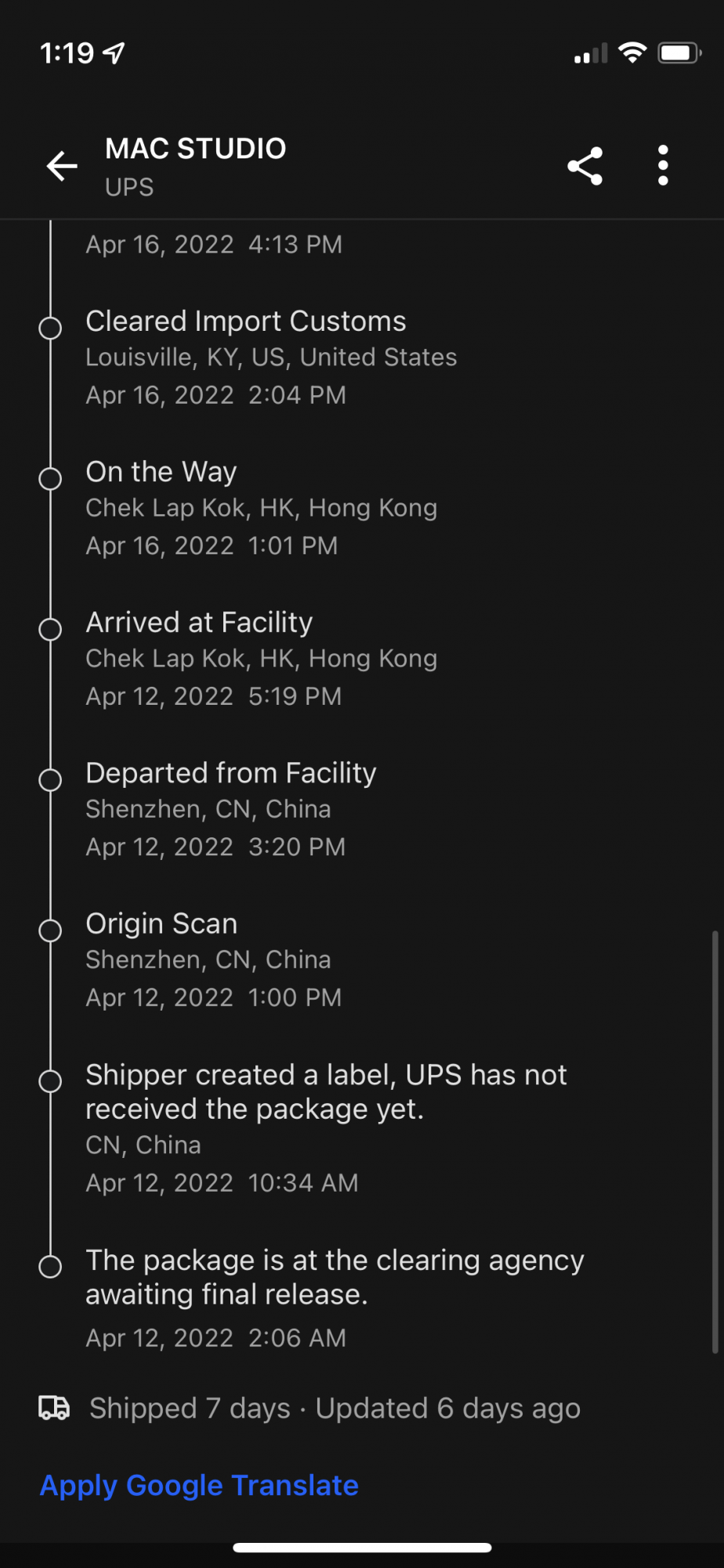 In the past I’ve usually bought year-end closeout models from Adorama and B&H, this is the first time I’ve ordered a new product direct from Apple and I gotta say, it’s pretty amazing to watch its progress moving from factories in Asia, through customs, and air shipped through Alaska and Kentucky to my door in San Francisco. Air shipping from Asia is not cheap. I used the AfterShip app to track its progress and seeing its current location on the map was quite cool. What a time to be alive.