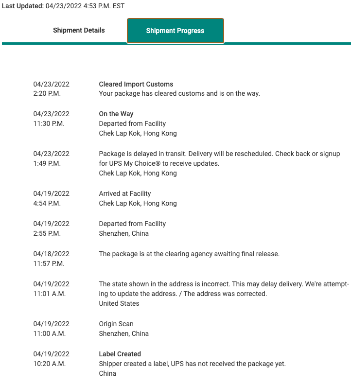 So, some good news! My Mac made it through customs and is due to arrive at my home in the USA on Monday the 25th. You can see from this timeline that it languished in Chek Lap Kok for approximately four days. Not the worst I've seen here. Let's hope it'll be only a few days and no longer for many others here!