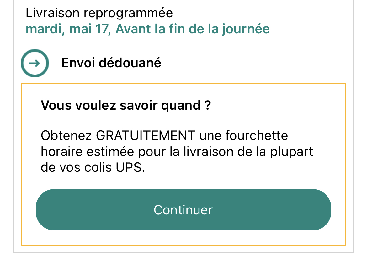 Estimated deliveryI inform you that UPS informs me that the package will arrive on Tuesday, May 17 between 8:45 a.m. and 11:45 a.m. Except that in Paris it is Tuesday, May 17 and it is 10:30 p.m.😄