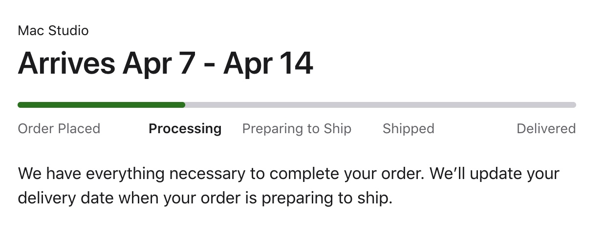 Still showing processing - with a delivery date of March 21st-22nd. My black keyboard & mouse arrived today. Very nice - but just ornaments until the computer arrives!Still showing ‘processing’ this morning. Looking at my credit card statement, I can see Apple have charged it for the Mac Studio. But not for the monitor yet. Maybe that’s got something to do with it.
