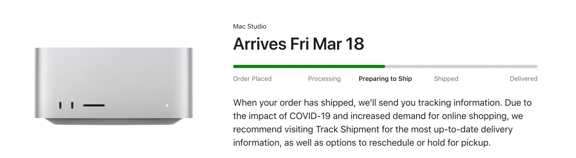 I have a tracking number now. March 21, right in the original estimate window.It will be funny if after all this hand wringing we all just start getting our new Macs according to original estimates.