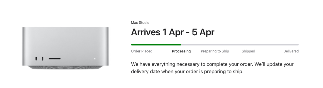 Wow my status went one step back. 😢 I'm back at "Processing". And my delivery date slipped from 21. - 23. March to 1. - 5. April. 😳My M1 Max 32 GPU cores with 64 Gb Ram and 1 TB SSD with a projected delivery date of 21. - 23. March just went to "Preparing to Ship".