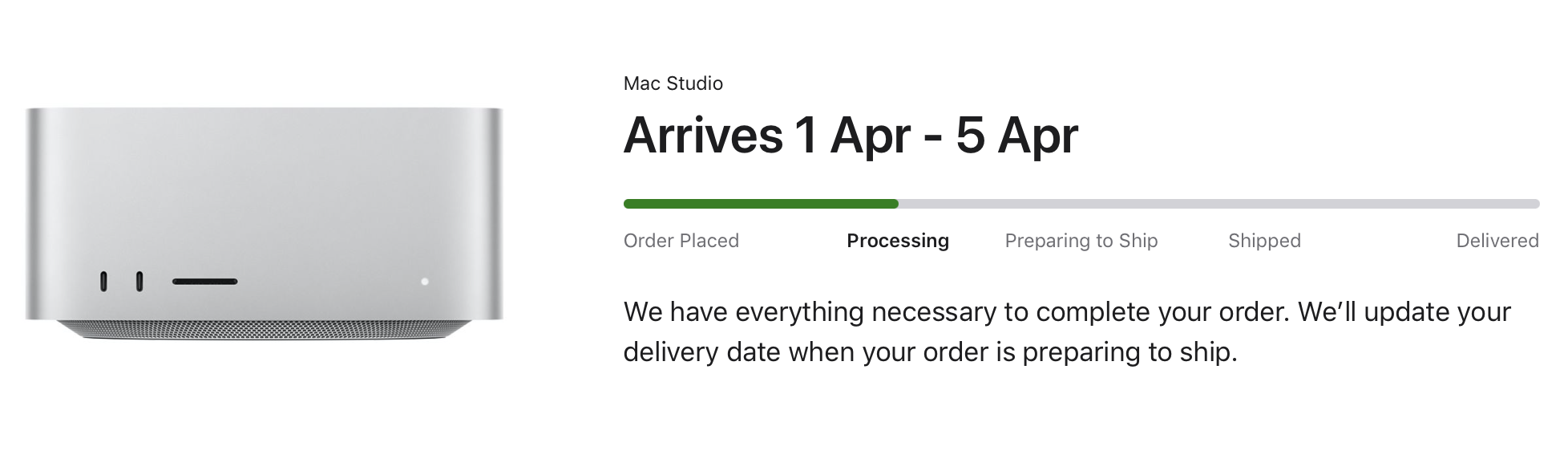 Mine went from 21-24 March to 1-5 April as well. Entry-level with 1 TB upgrade. Mine hasn't been preparing to ship at any point though.Wow my status went one step back. 😢 I'm back at "Processing". And my delivery date slipped from 21. - 23. March to 1. - 5. April. 😳