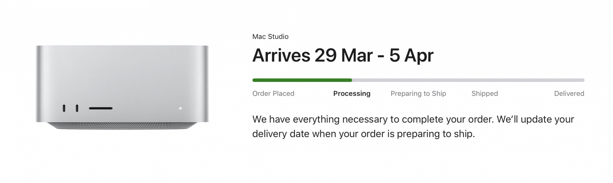 My delivery date was scheduled for March 30 to April 6, but it may come this week, considering my Studio Display arrived one day after it shipped.
