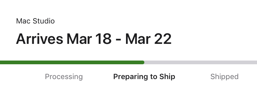 My order switched over to Preparing to Ship this morningUltra/20 CPU cores/64 Gfx cores/128 GB/4 TB