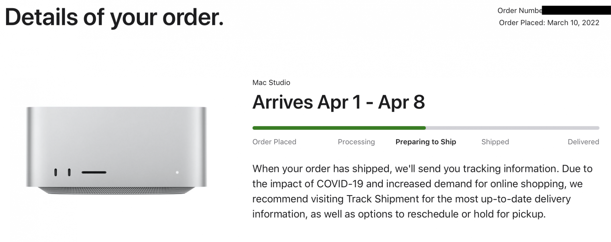 I'm writing from the west coast of the U.S. Over the years I've noticed that my Apple order status only seems to change between midnight (here) and 7:00 AM. In other words, I wake up to the change but it never seems to happen during the day.My Mac Studio overnight switched to preparing to ship. No tracking number in UPS My Choice yet. Studio Display still shows as processing.