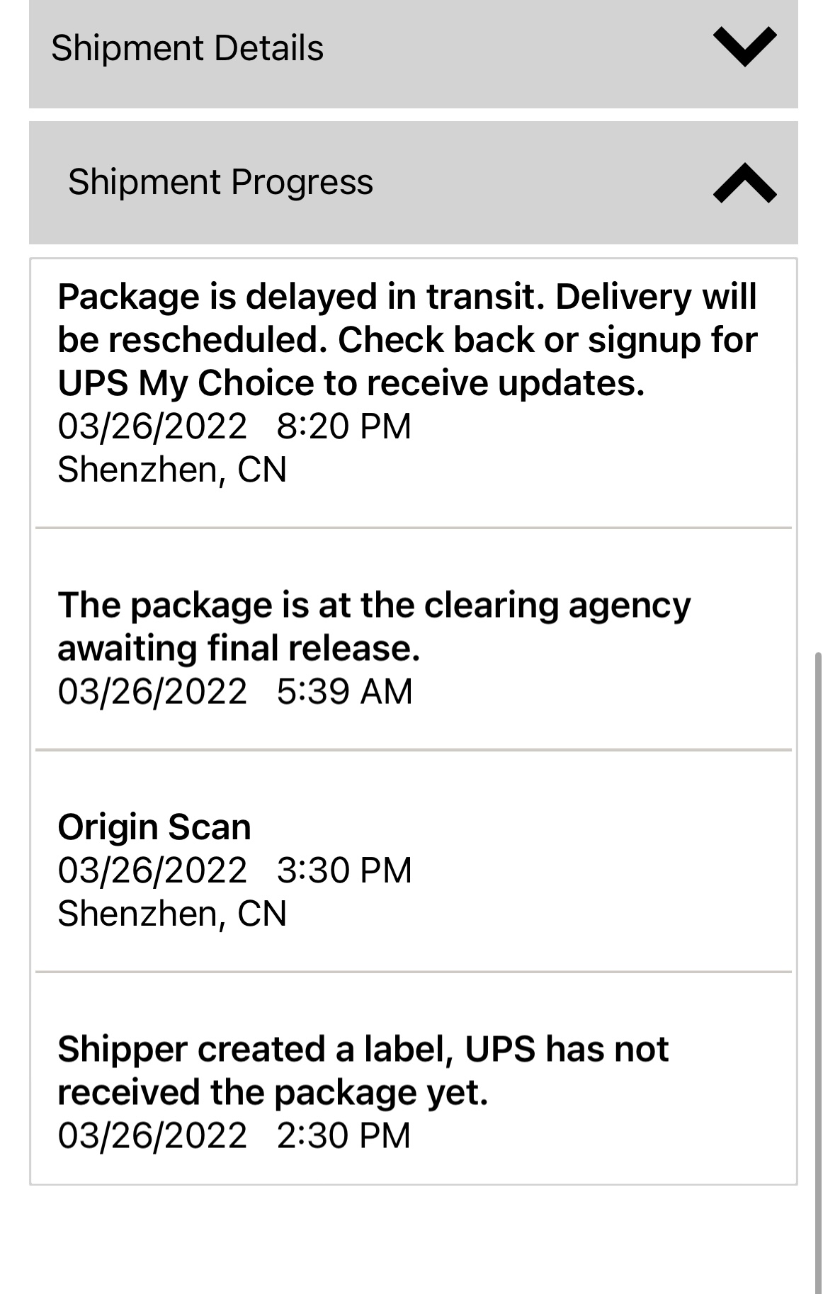 Mine's in delivery delayed too (Apple thinks the 4th for delivery), but I had some Lenovo Laptops that arrived this week and they went through the whole same process. I think Shenzhen is having some infrastructure problems still from Covid. It turned out we received the laptops 2 days before Lenovo said they would be there and UPS only noticed that the day before we got them. Maybe UPS is having timing problems too!