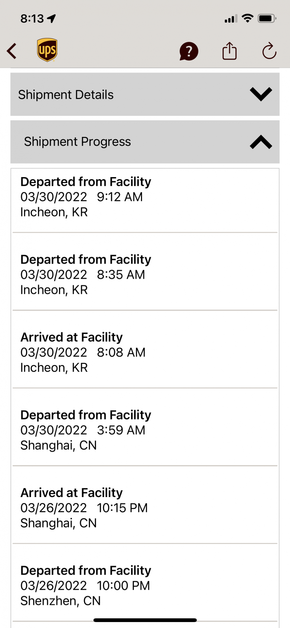 7:27 P.M. | Your package is in transit. We're updating plans to schedule your delivery. / The package will be forwarded to a UPS facility in the destination city.