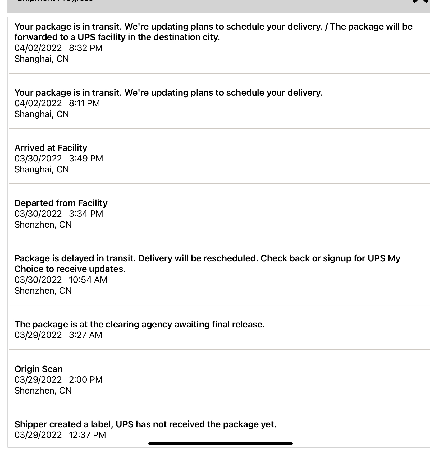 This is what UPS shows in mine:Weird. So am I the only one of those of us who arrived into Shanghai on 3/30 seeing actual movement?