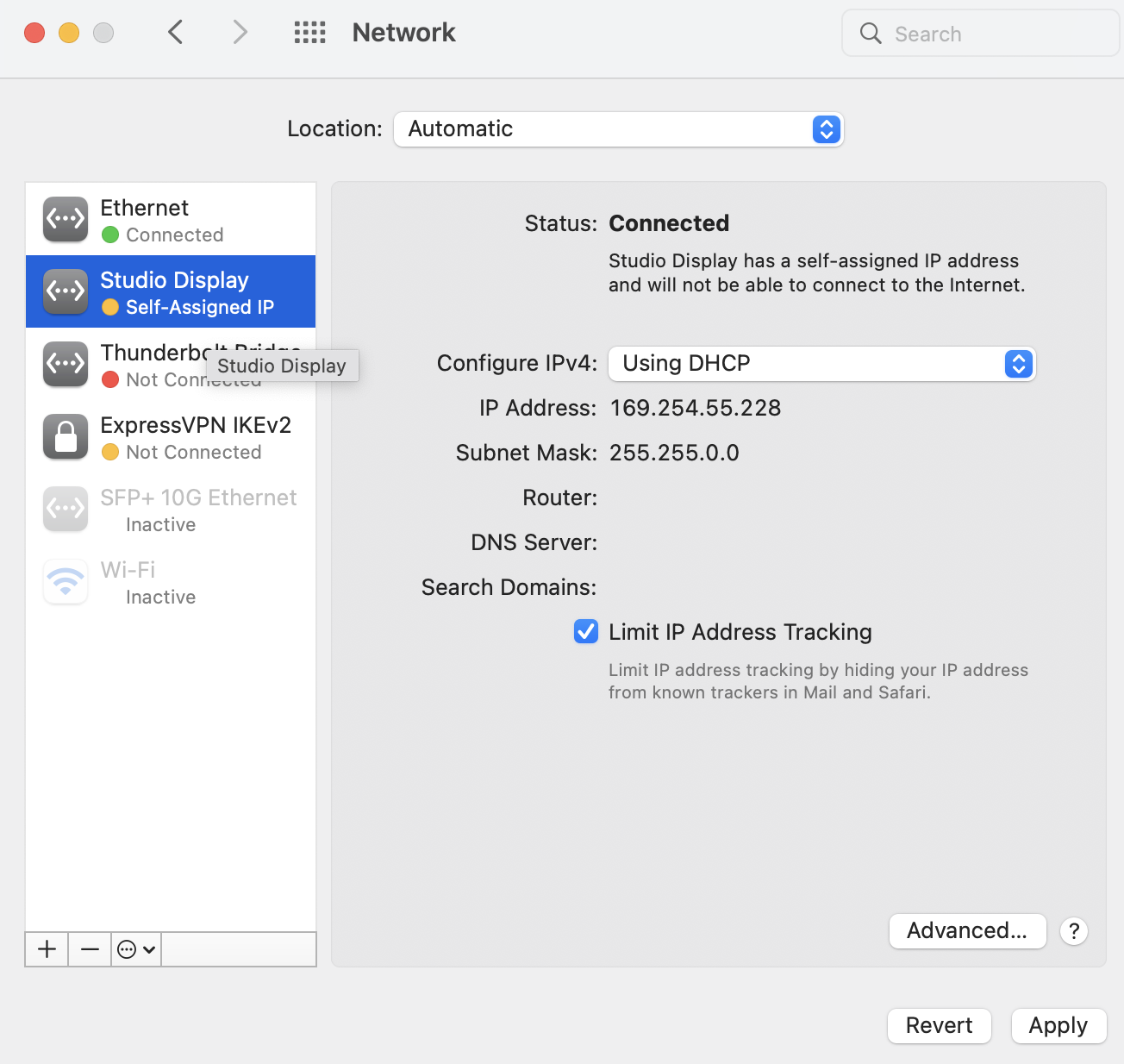 In the list of network adapters in the left column there was an entry for the Studio Display and it's using a self-assigned IP address.