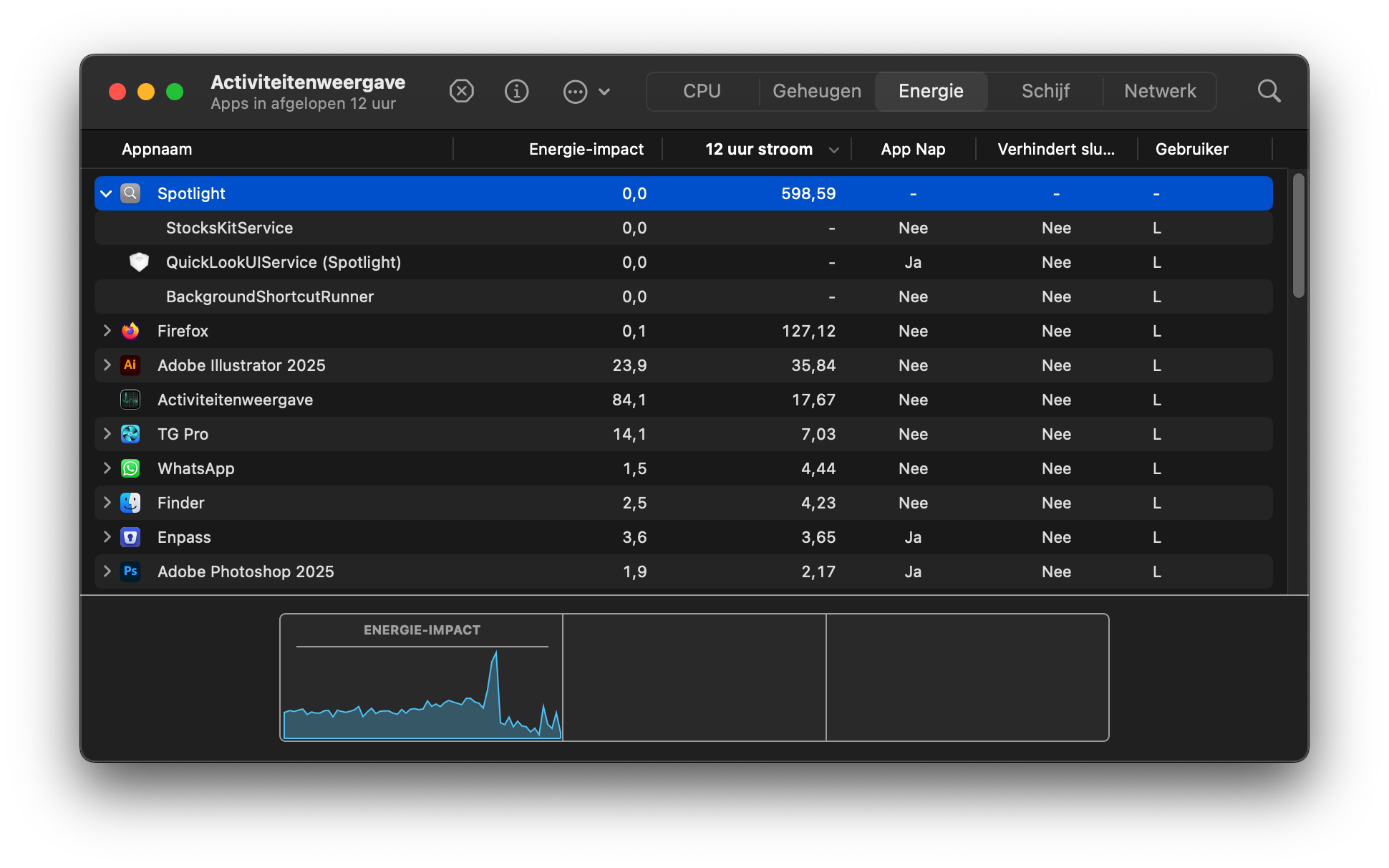 So I looked at the Activities and found that non-Safari browsers and Adobe Photoshop and Illustrator, but mostly Spotlight are quite active.
