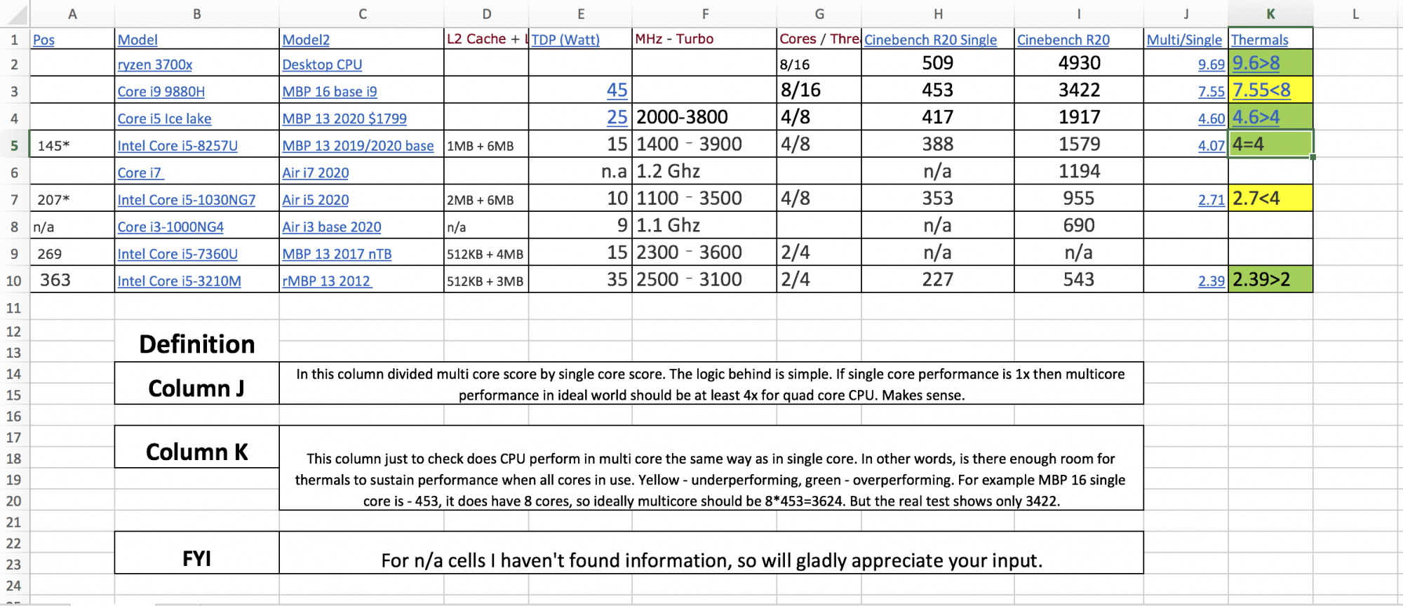 Since 2.7x in multicore implies that there is a problem with cooling, we can assume about projected numbers IF the cooling was on par at least with base MBP 13. Assumed score should be in the range of 3.5x-4.2x, which would gave us the score R20 multiple core of 1235 - 1482.