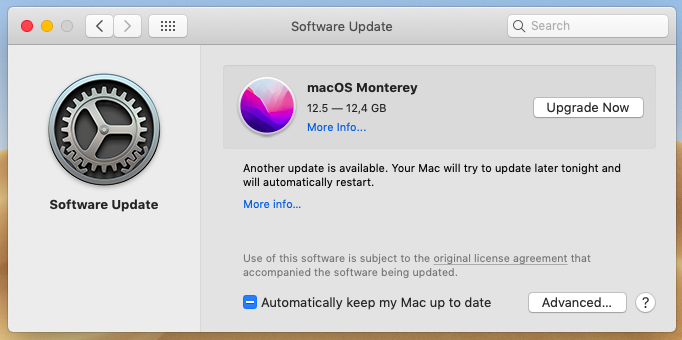 - a prompt to upgrade to macOS Monterey 12.5, with a 12,4 GB download (and I heard that installing that for Mojave requires 26 GB of available storage according to Apple).