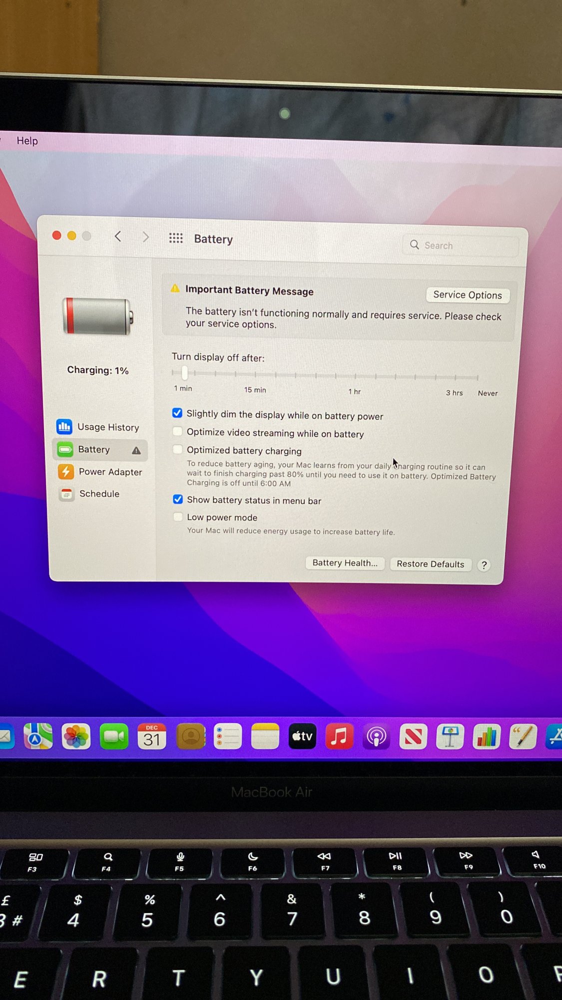 I've had a MacBook Air M1 (2020 model) that has had very little use since I purchased it last May. I admittedly haven't used it for a little while, and after switching it on tonight, it appears the battery won't charge, and I've been recommended to service the battery: