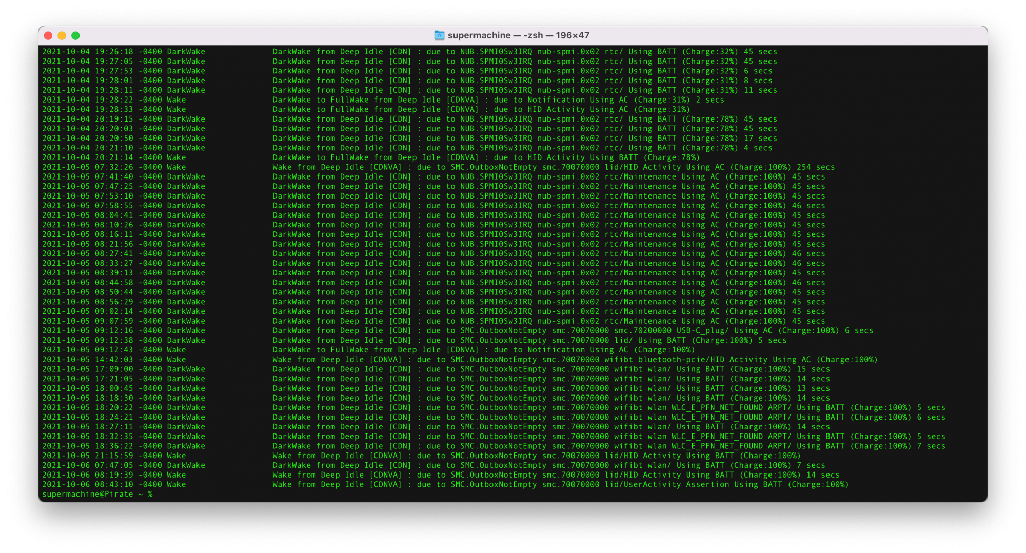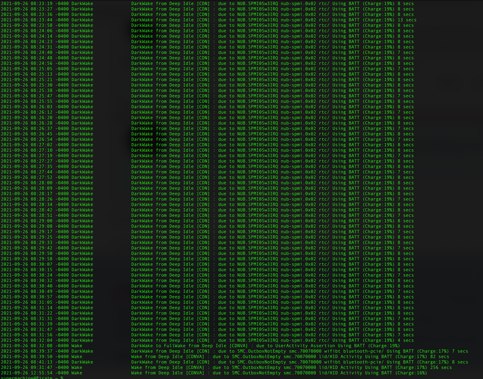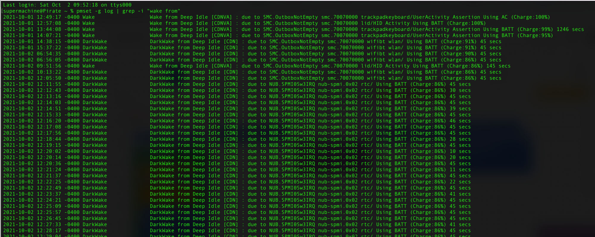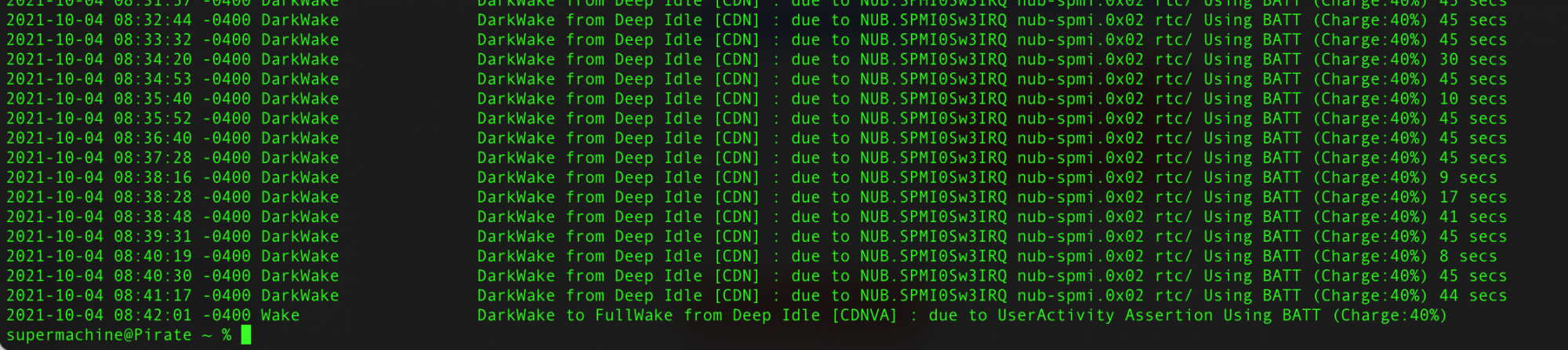 2021-09-27 23:17:48 +0200 DarkWake DarkWake from Deep Idle [CDN] : due to NUB.SPMI0Sw3IRQ nub-spmi.0x02 rtc/ Using AC (Charge:100%) 45 secs