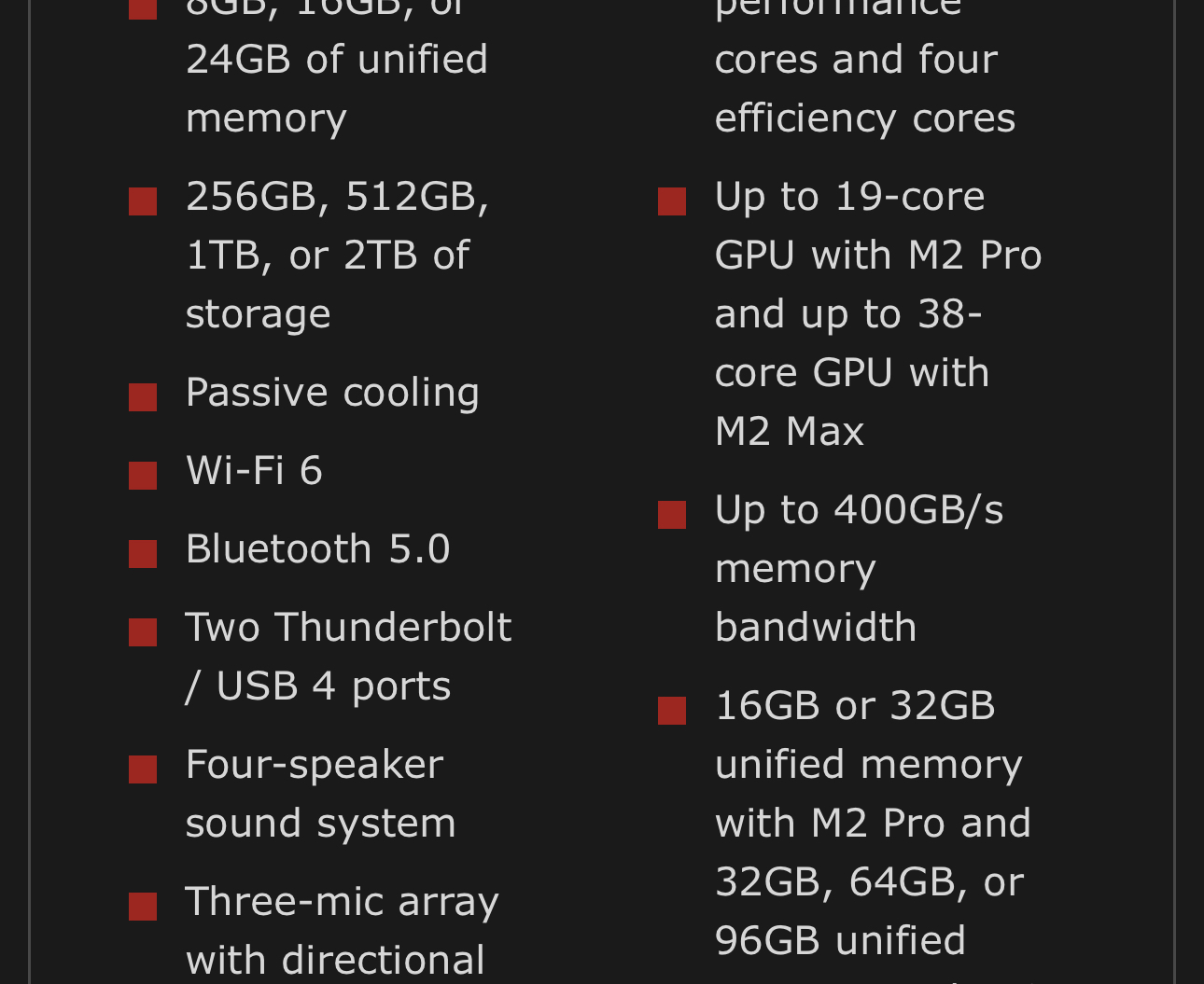 - 16GB or 32GB unified memory with M2 Pro and 32GB, 64GB, or 96GB unified memory with M2 Max