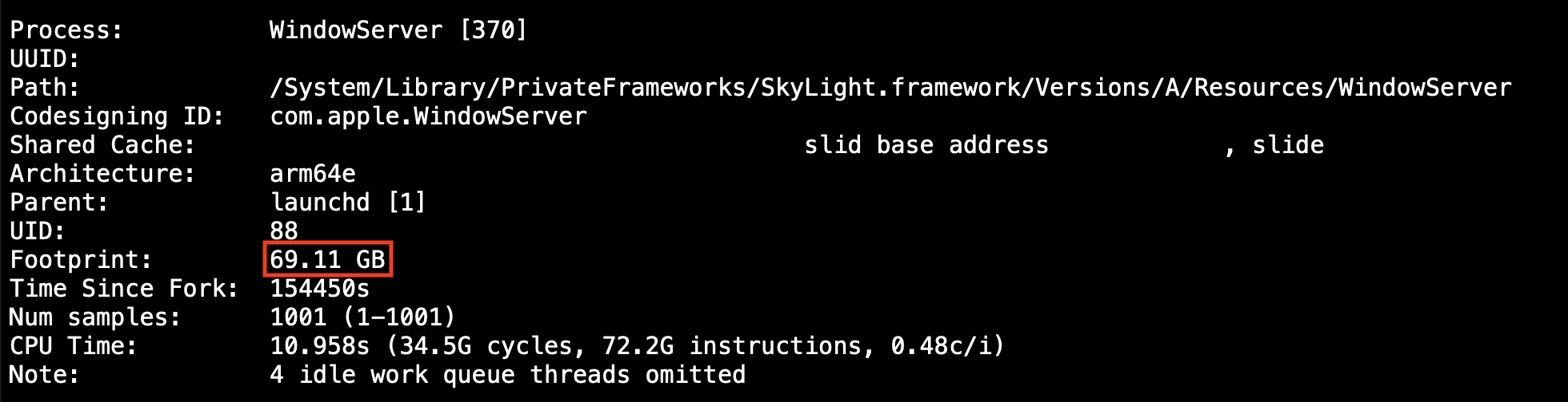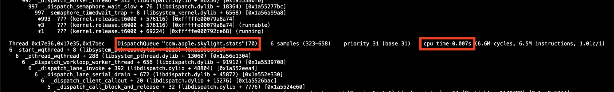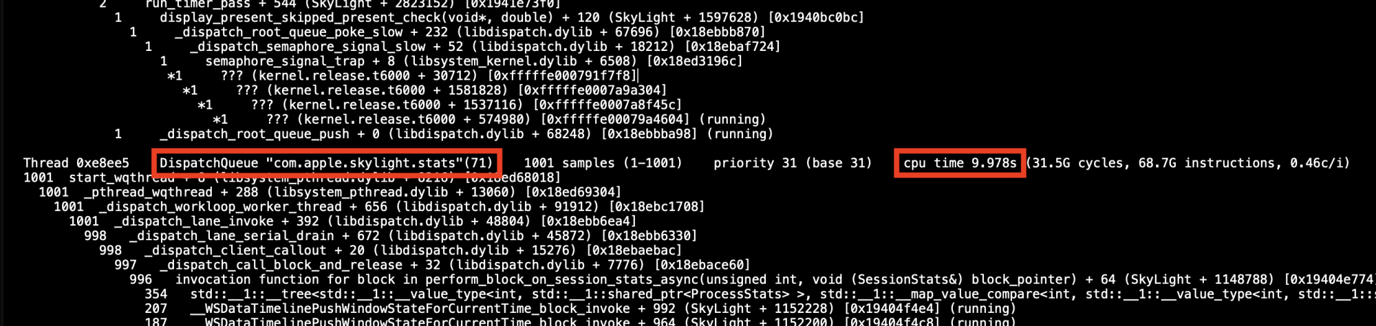 This will collect a 10-second sample of all running processes, with the selected process at the top of the list below the report header. Search for "com.apple.skylight.stats", and check the value reported for