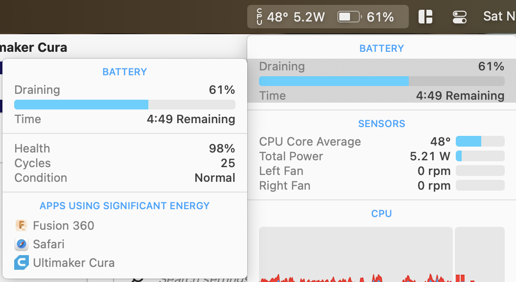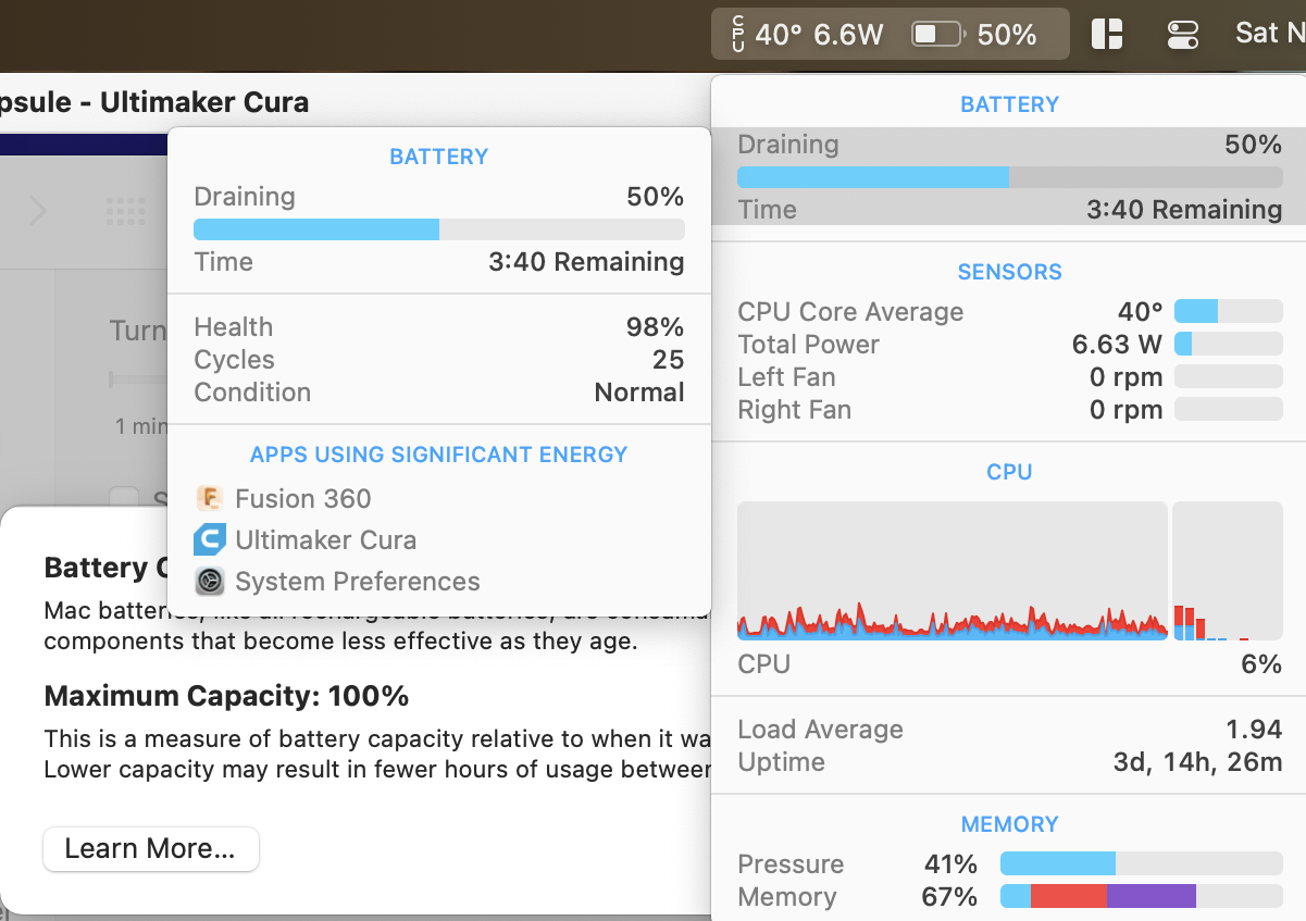 This is after 3 hours of Fusion 360. Fan isn't even on the entire time. Also you can see I occasionally checked in to Cura to slice my finished 3D models. Also was checking websites and listening to some music (not all the time) in Safari via Youtube.