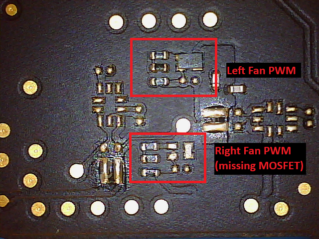 - bridge the output from left fan PWM to right fan PWM, using the nearby test pads, thereby tying the two together