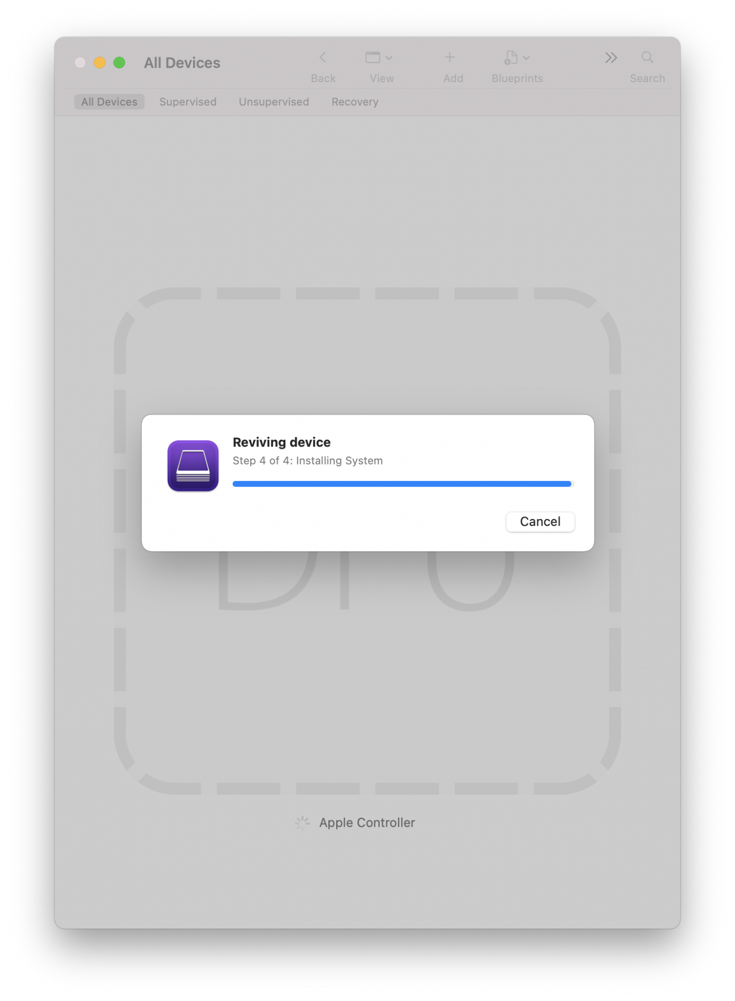 The MBP no longer appears dead (i.e. no sound, no display/Touch Bar, no lights), although, I can activate DFU. Using Apple Configurator v2.15.1, both Revive and Restore commands end with: