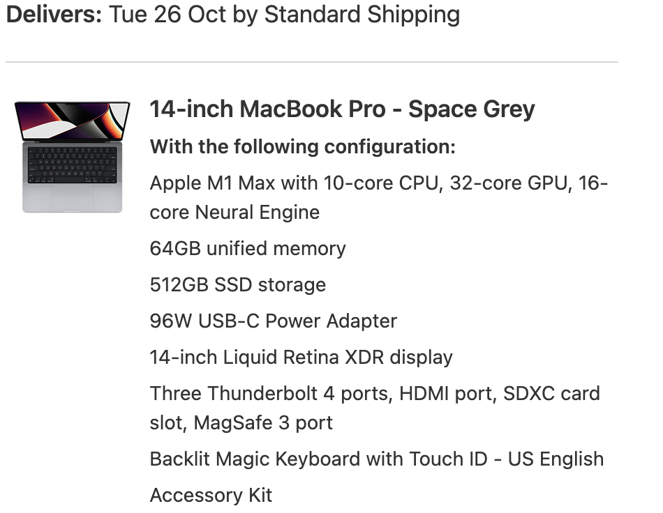 I had to cancel one of the order because I ordered two Macbook Pro. One Macbook Pro M1 Pro and 1 MacBook Pro M1 Max. I panicked and blacked out so I was trying to order as many Mac's as I could to obtain a launch delivery date. All is well now. Rough morning today!