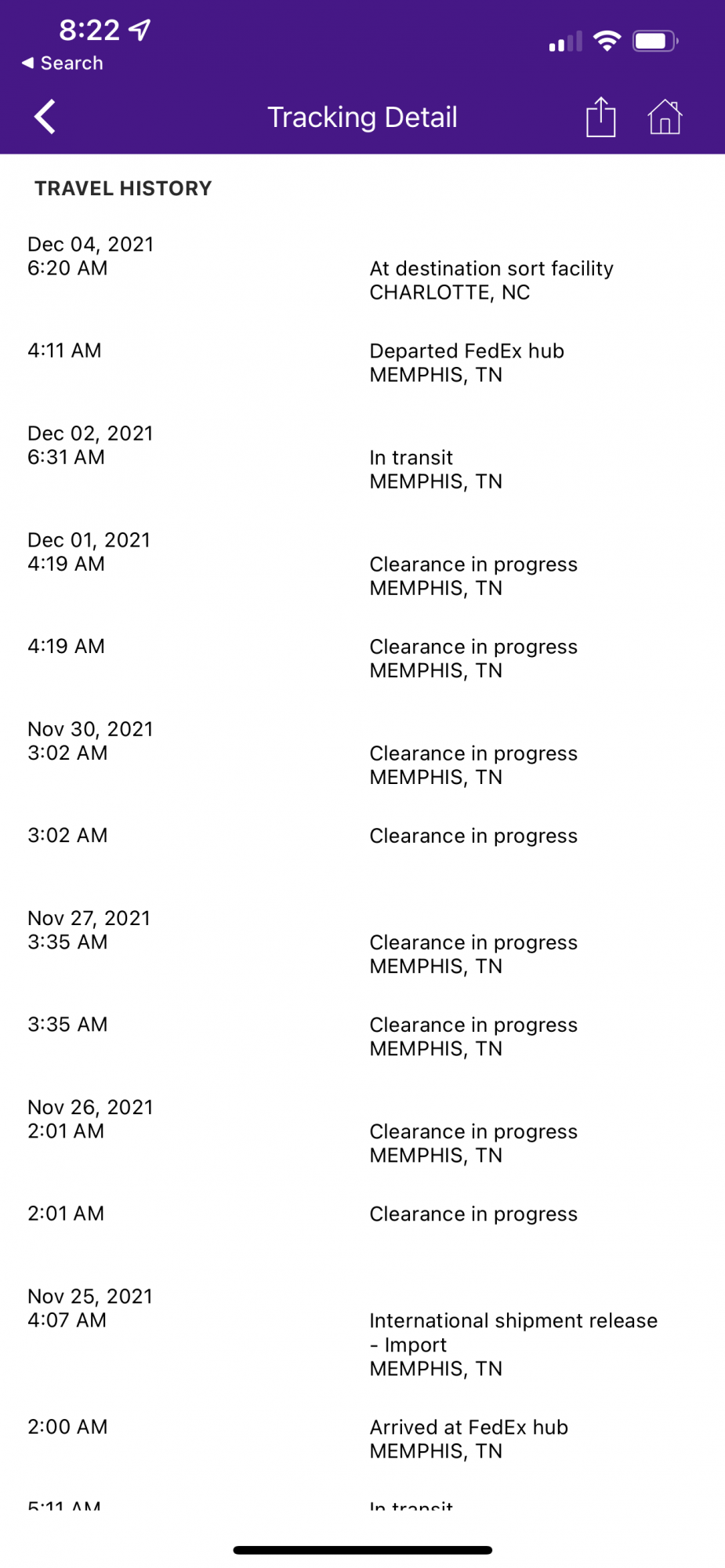 Well, crap… it’s in Memphis. So much for heading straight to Newark from Oakland. Now, I’ve pretty much lost hope for the Wednesday 12/8 scheduled delivery. My MBP will likely be in customs purgatory for the next several days. Ugh.It will probably avoid Memphis if it went through CA. Did it clear customs in CA according to the scans?