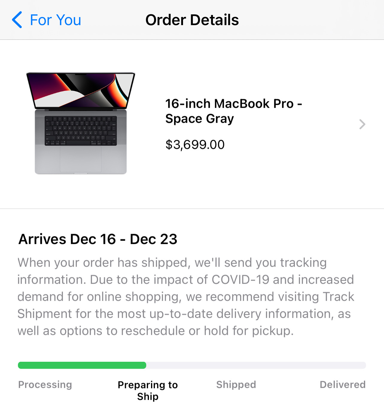 Mine did that. Went preparing to ship and the eta changed from 30 nov-07 dec to 16-23 dec but ultimately arrived on 6 decOrdered Oct 27th. 16 inch M1 Max, 32 core GPU, 64GB RAM, 2 TB. Has been estimated to arrive Dec 14-21. Just went to Preparing to Ship this morning.