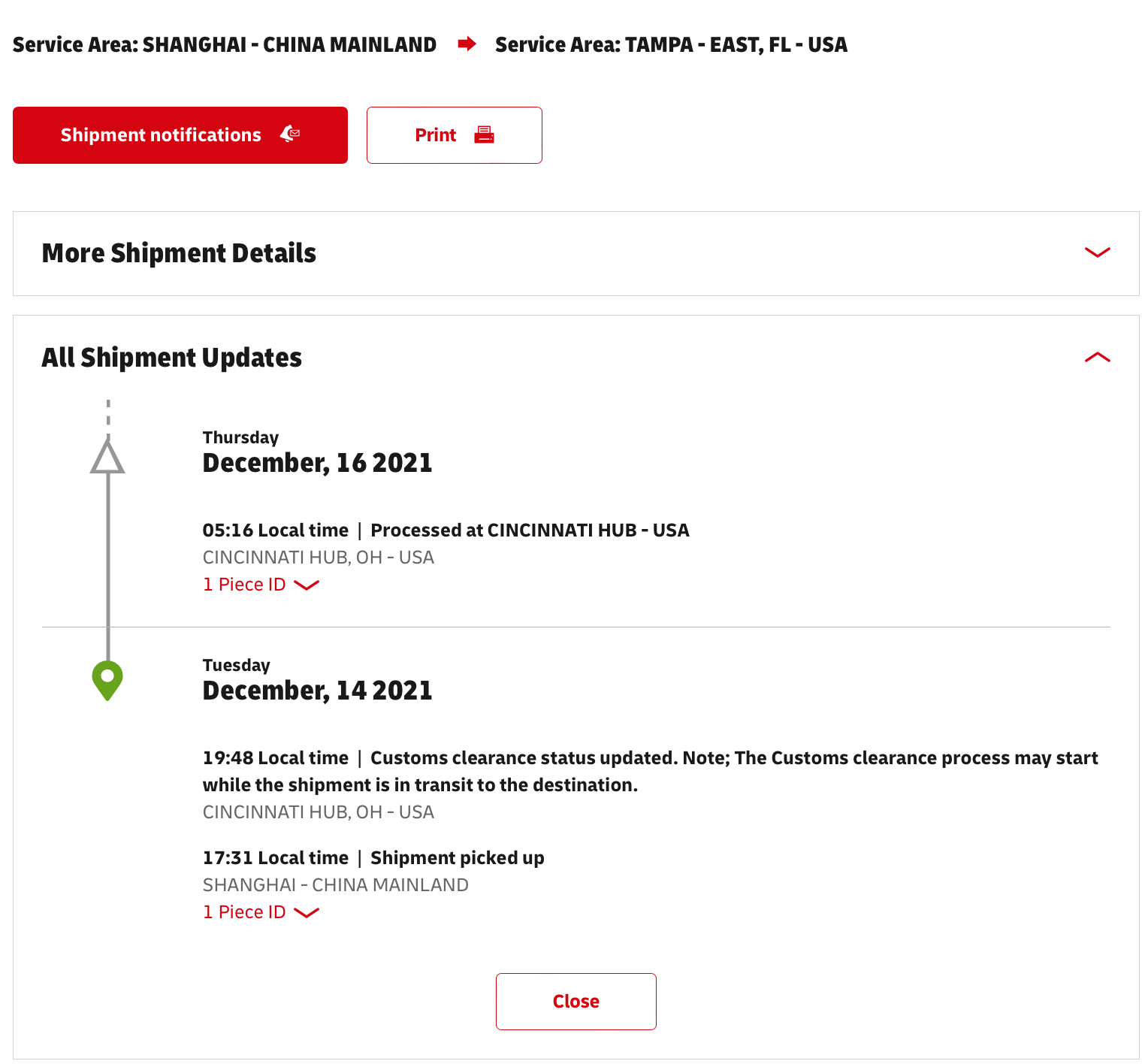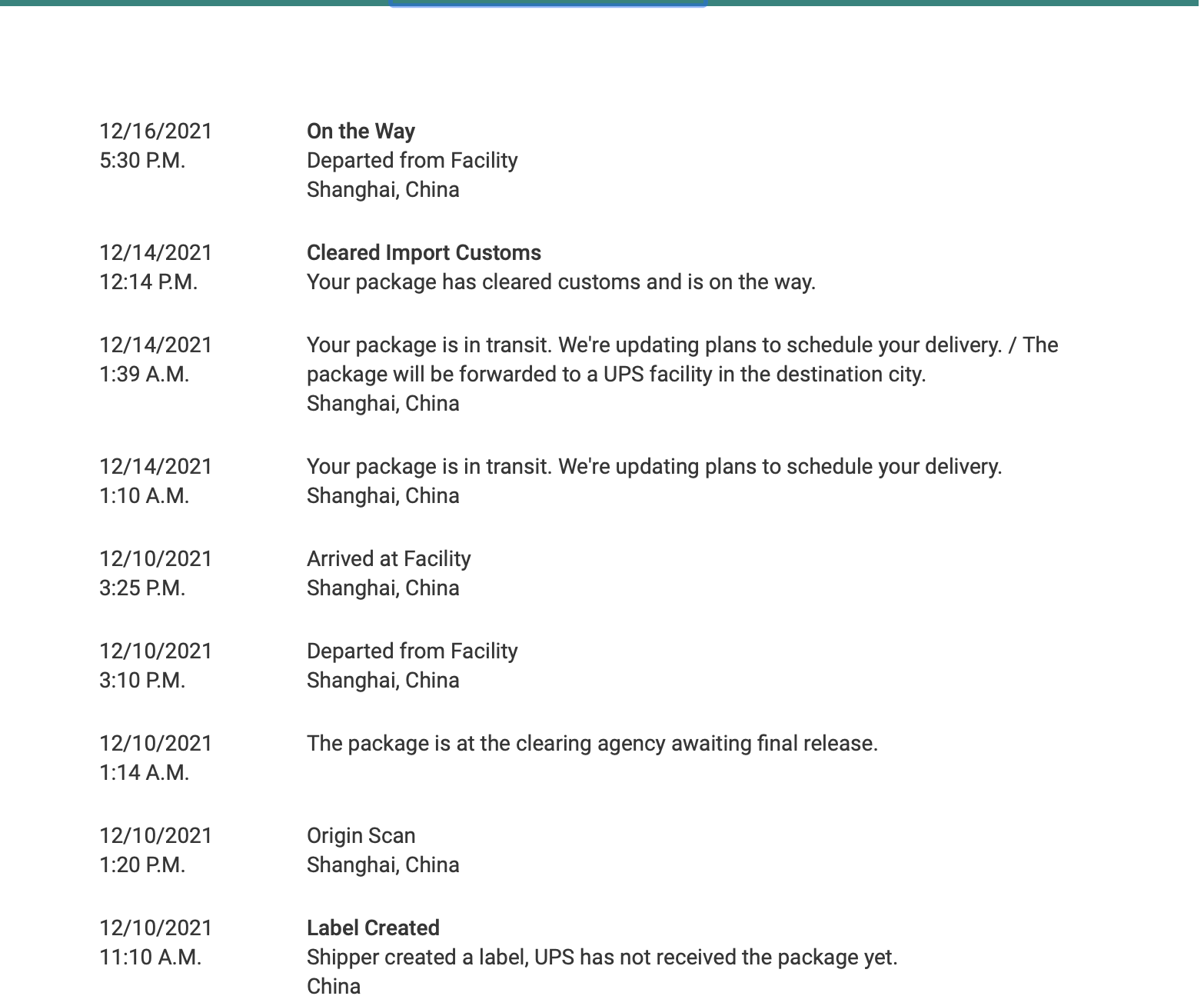 12/14/2021 1:41 A.M. Your package is in transit. / We're updating plans to schedule your delivery. The package will be forwarded to a UPS facility in the destination city. Shanghai, China