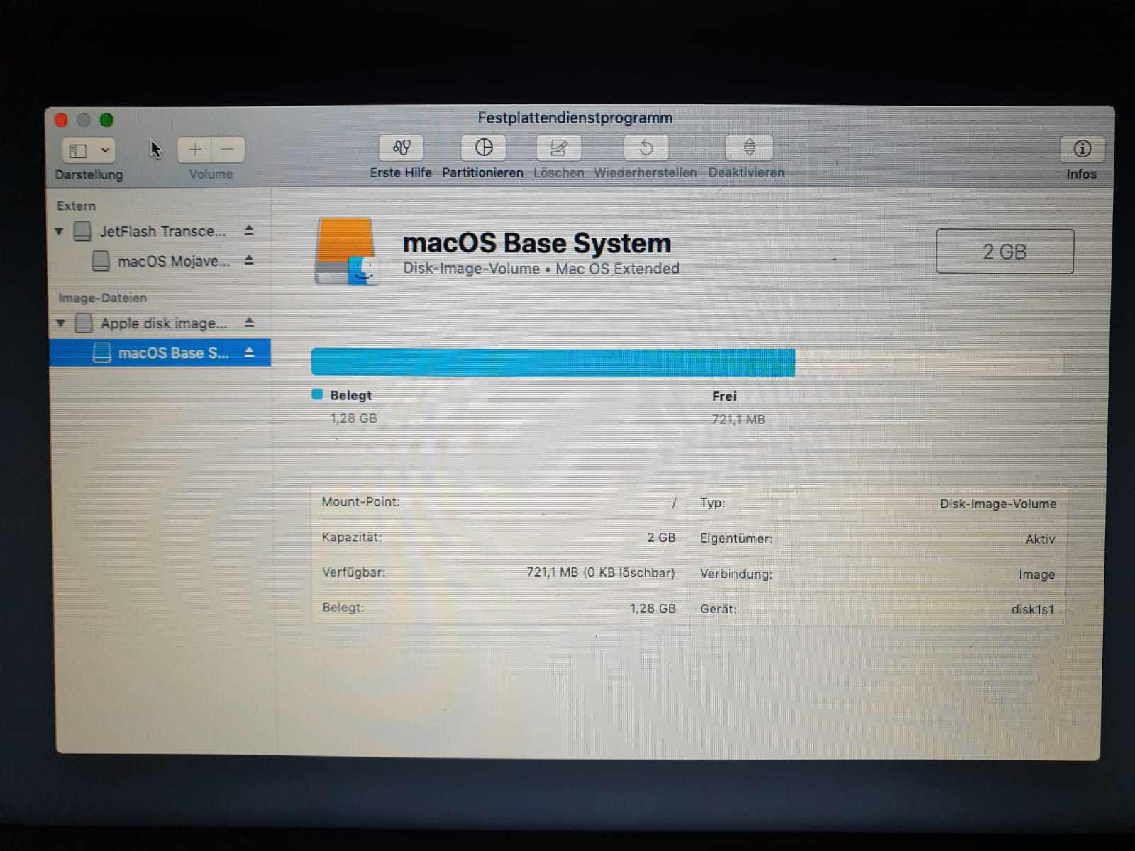 Unfortunatly "Disk Utility" shows only the external drive (USB Stick 32GB) and "macOS Base System" (Image with 2GB). I cant see any other disk.