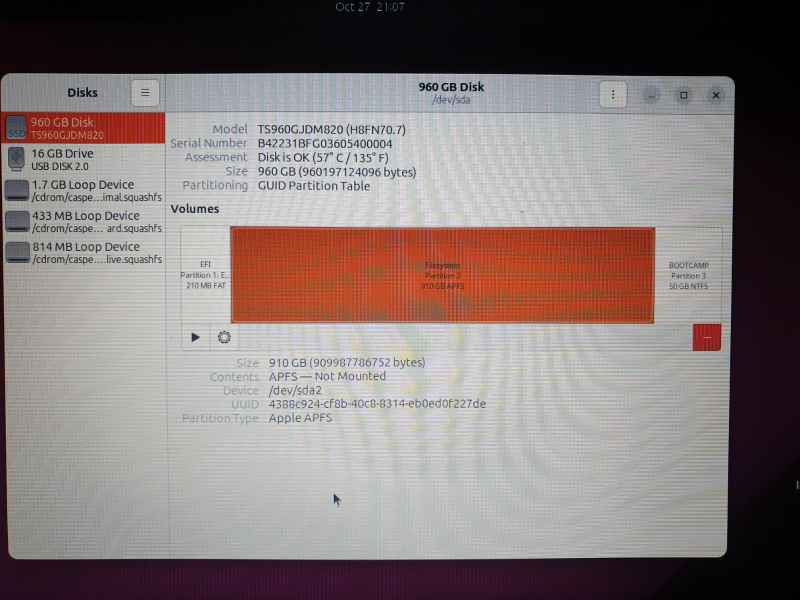 2. The last one is the internal disk being recognized by Ubuntu LiveDisk (but Ubuntu cant mount the image, because of APFS format, I think)