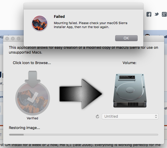 You can download the Sierra installer using the new Tools menu of version 4.0.6 of my patch tool.Thank you for this tool, I'd been looking for something like that. Unfortunately it fails on my MBP 09 with the message "--file not supported for /".