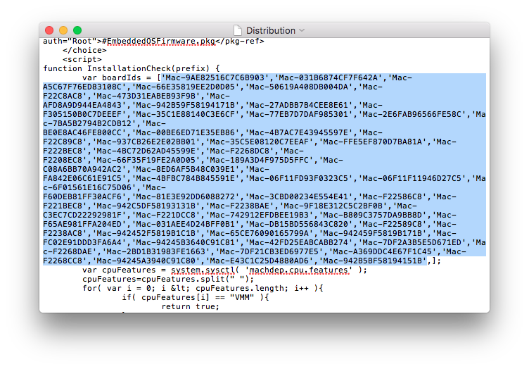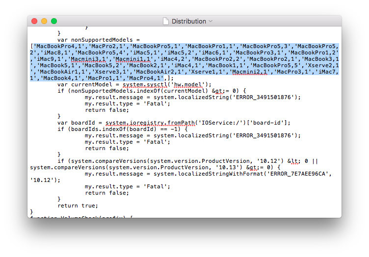 6: In the "Distribution" file, scroll down to "var nonSupportedModels =" and remove your Mac's model from the list.