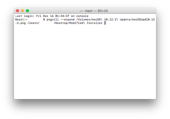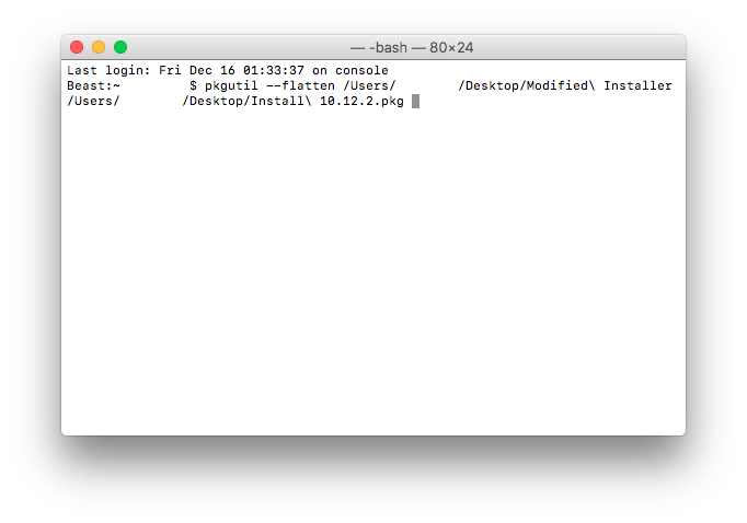 8: Flatten the modified pkg in terminal (pkgutil --flatten /modified_source /destination). In this case, I flattened the "Modified Installer" folder on my Desktop to a .pkg named "Install 10.12.2.pkg" on my Desktop. This step may take a minute or two so wait until complete (the command prompt will return and the red close window button will not have a black dot).