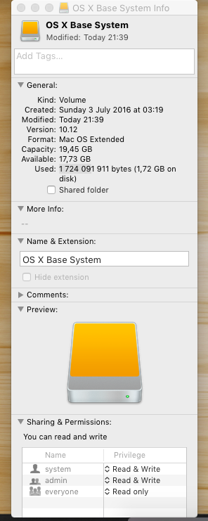 Ok, one more possibility on what the issue could be. Go to your Finder menu, select "Go" then "Go to folder". Type "/Volumes", and make sure there's nothing there named "OS X Base System". If there is, unmount or delete it, then try running the tool again.@dosdude1...the language on my system is English and I tried it with my both external drives WD passport 320GB... it's not working and same thing, Prohibited sign on booting after patching macOS Sierra