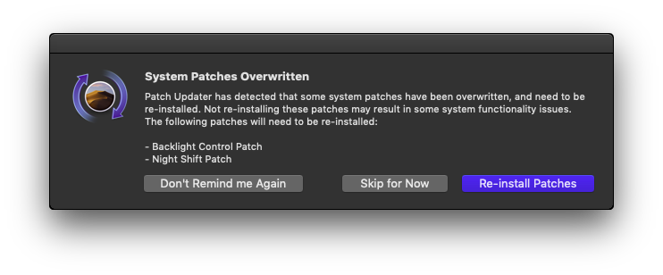 Mine is find Backlight Control Patch and I re-install it but now I am getting a kernel panic machine never boot. Loading bar coming and it is loading 3/4 and restart again. I tried re-patch with the macOS Post Install rebuild cache but it doesn't help. Always the same thing happening.Just finished implementing a new Patch Updater feature! Now, Patch Updater has the ability to check the integrity of patches installed on your machine, allowing it to detect cases where system patches get overwritten (such as during a software update, etc.) When such a case occurs, it will alert you and prompt you to re-install the affected patches automatically. The new Patch Updater version is, of course, available as an update through previous Patch Updater versions. Also, both this new patch integrity check feature, and automatic update checking, can be disabled via the new System Preferences item.